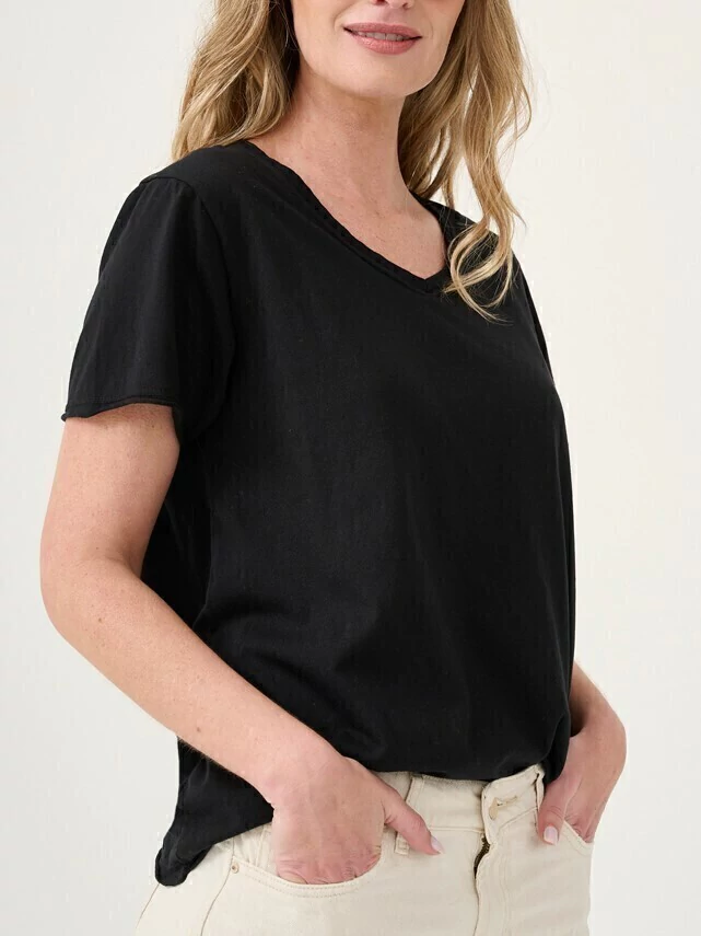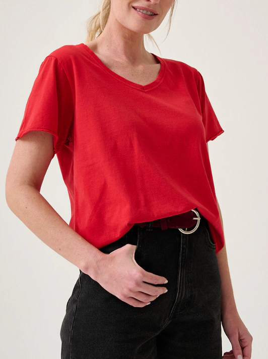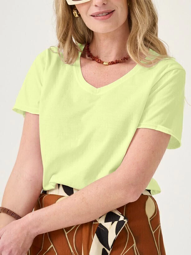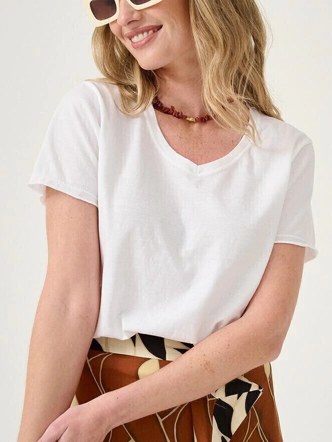 Elaborada en 100% algodón con hilado jersey, esta remera blanca es la combinación perfecta de suavidad y resistencia. Su diseño atemporal con cuello en "V" la convierte en una opción ideal para cualquier estilo, proporcionando un ajuste cómodo y fresco. Versátil y ligera, es la elección perfecta para un look relajado sin perder elegancia.