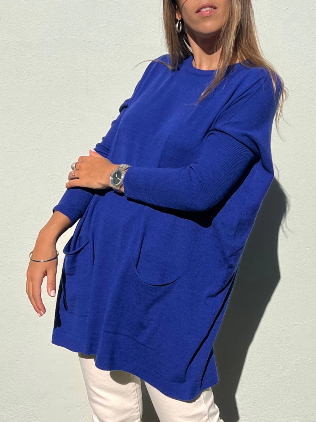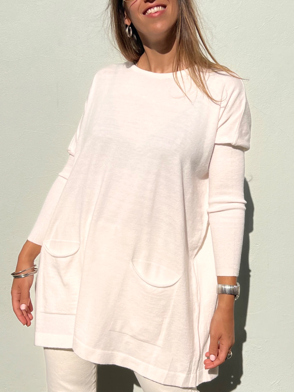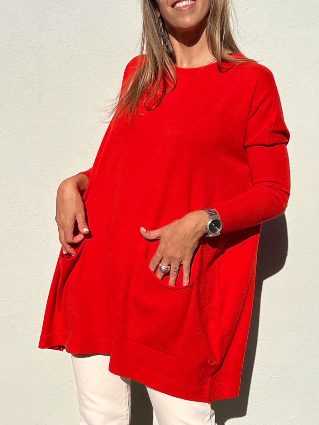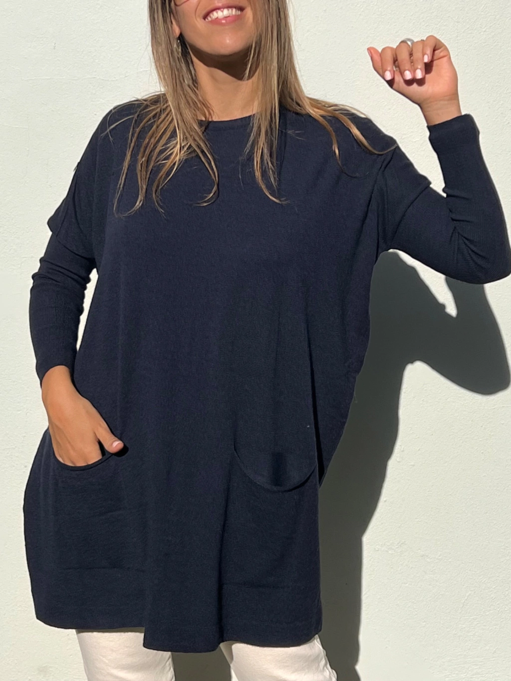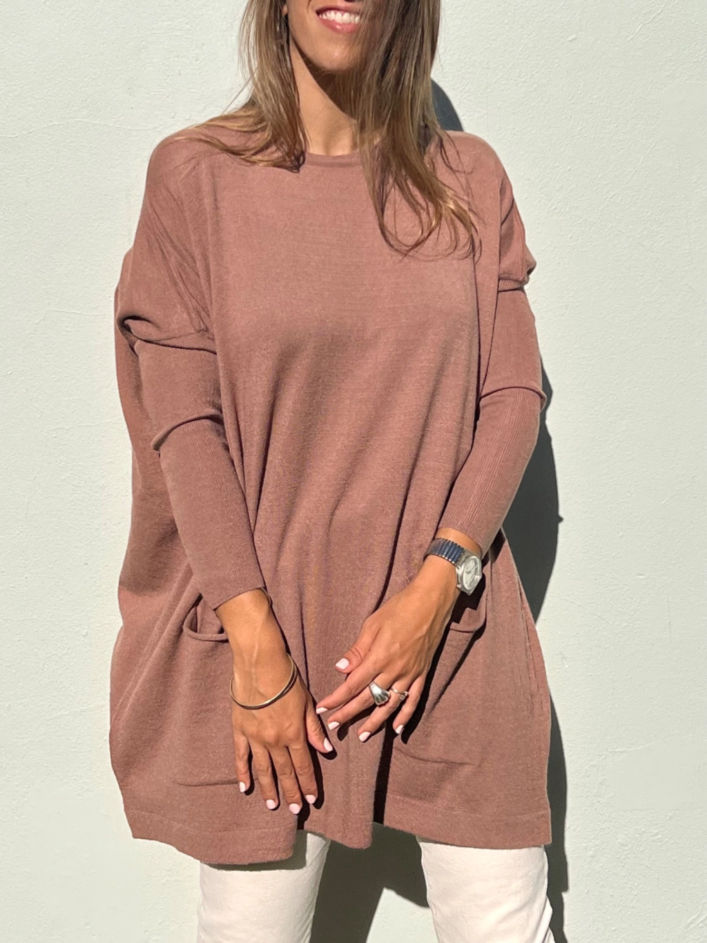Sweater estilo oversized con bolsillos TALLE ÚNICO tejido hilo Bremer. Las mangas del antebrazo son suaves y ceden, ajustandose y moldeandose a tu antebrazo.