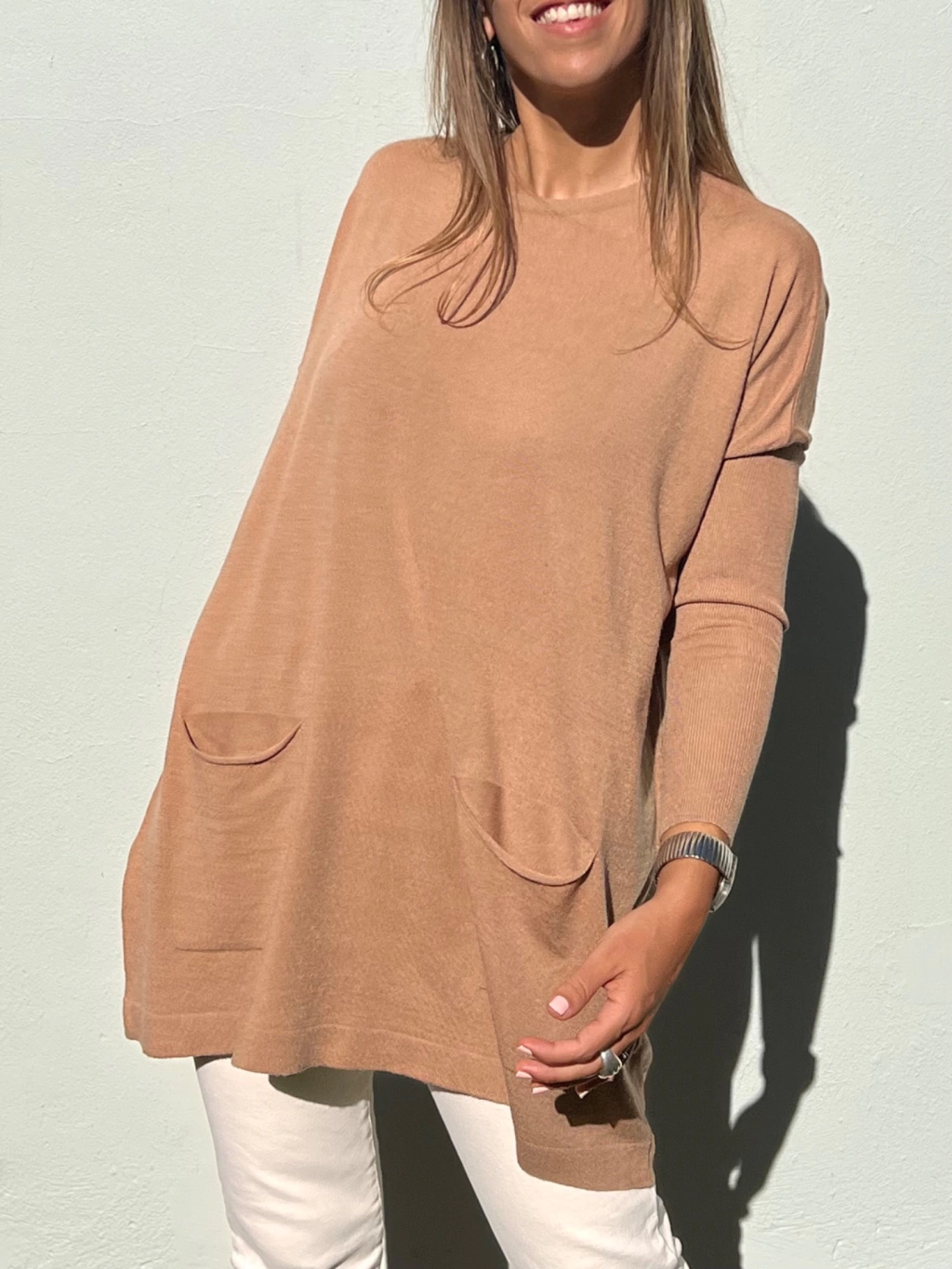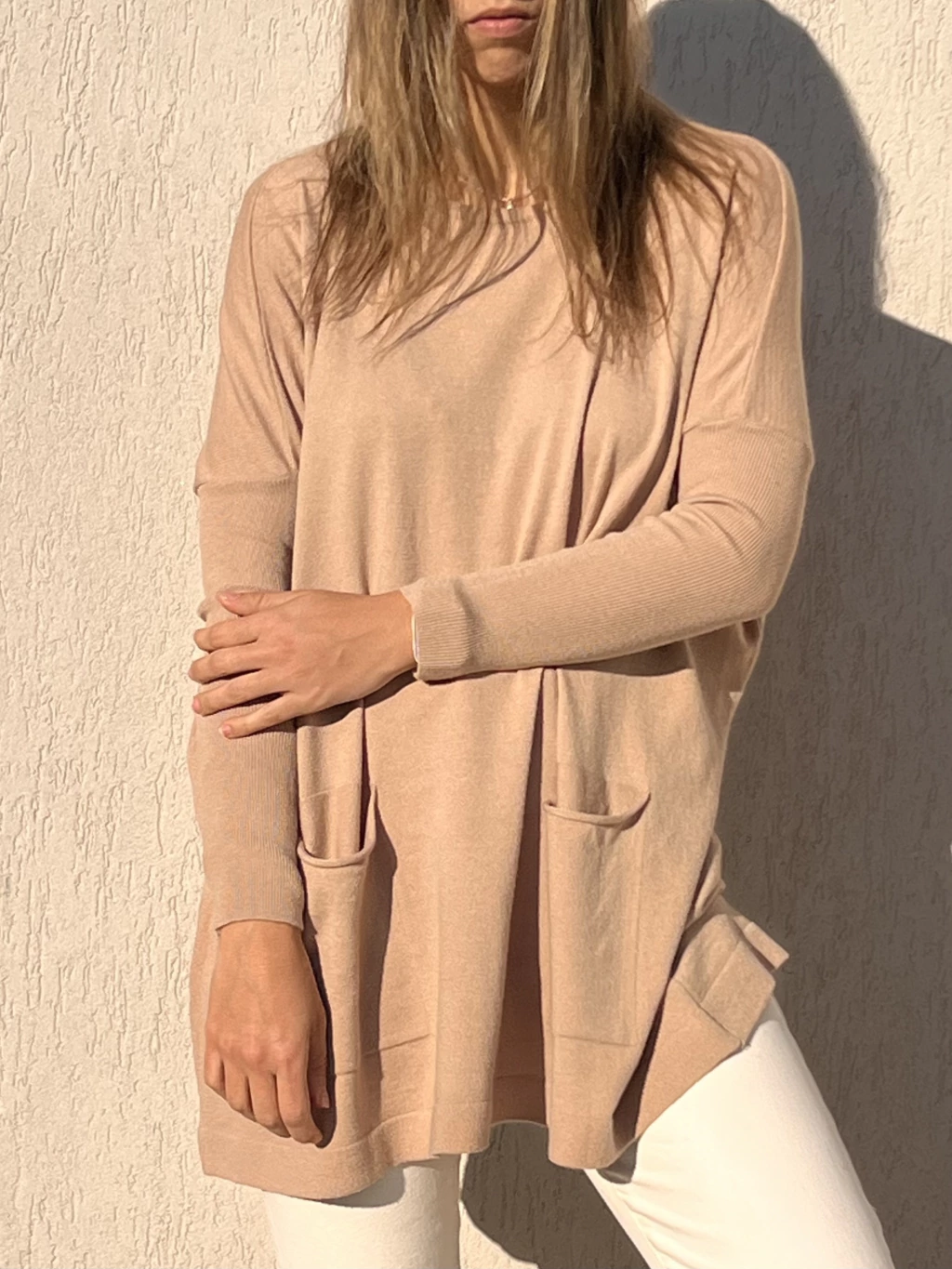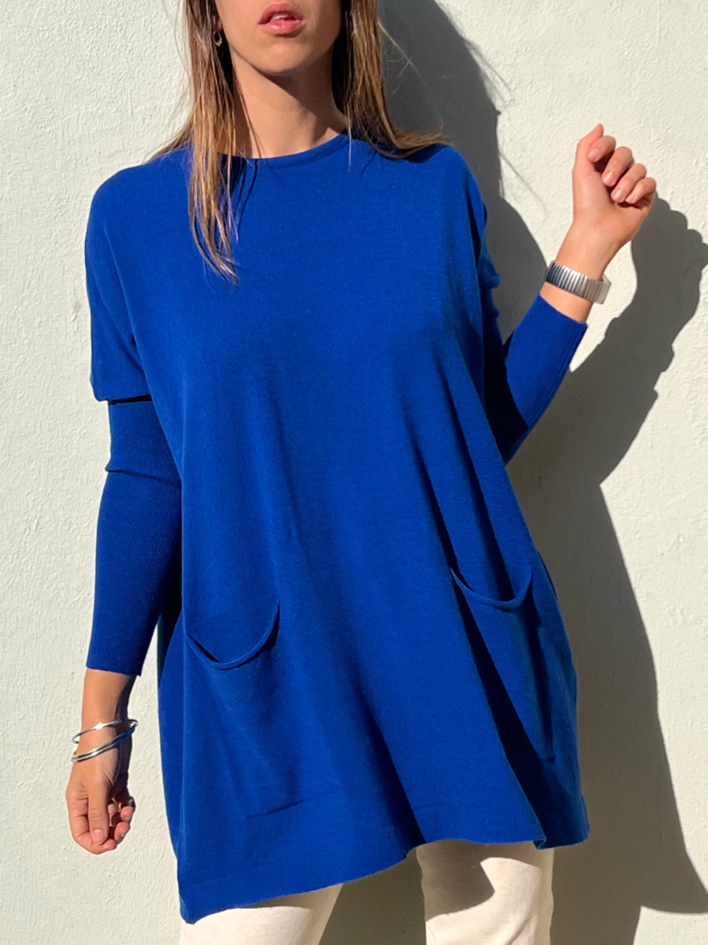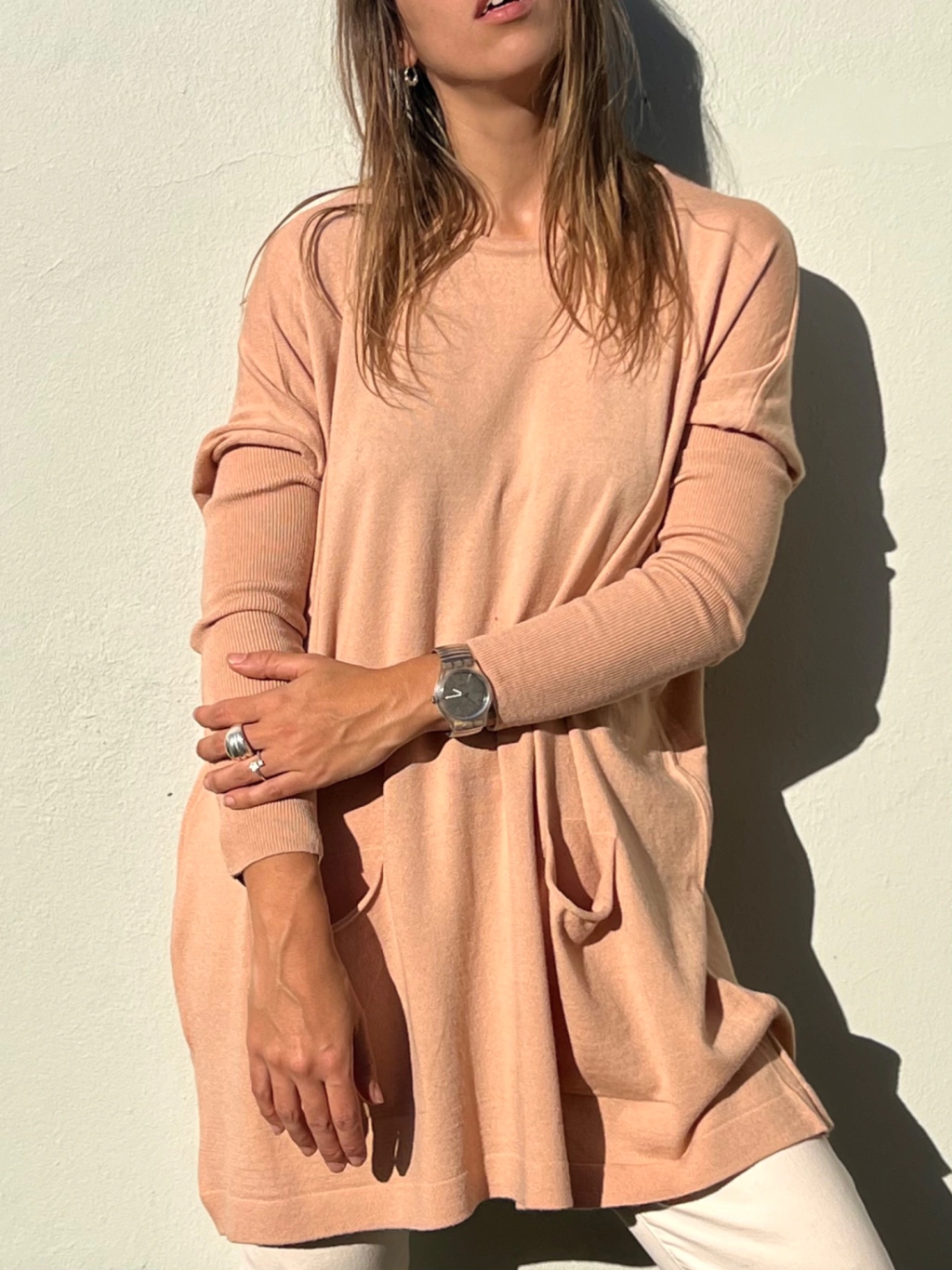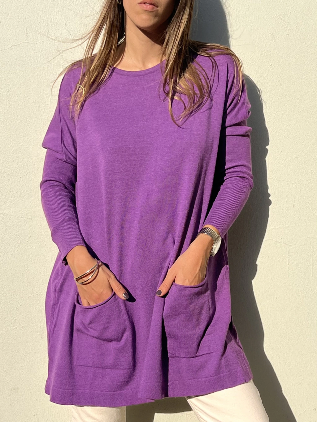 Sweater estilo oversized con bolsillos TALLE ÚNICO tejido hilo Bremer. Las mangas del antebrazo son suaves y ceden, ajustandose y moldeandose a tu antebrazo.