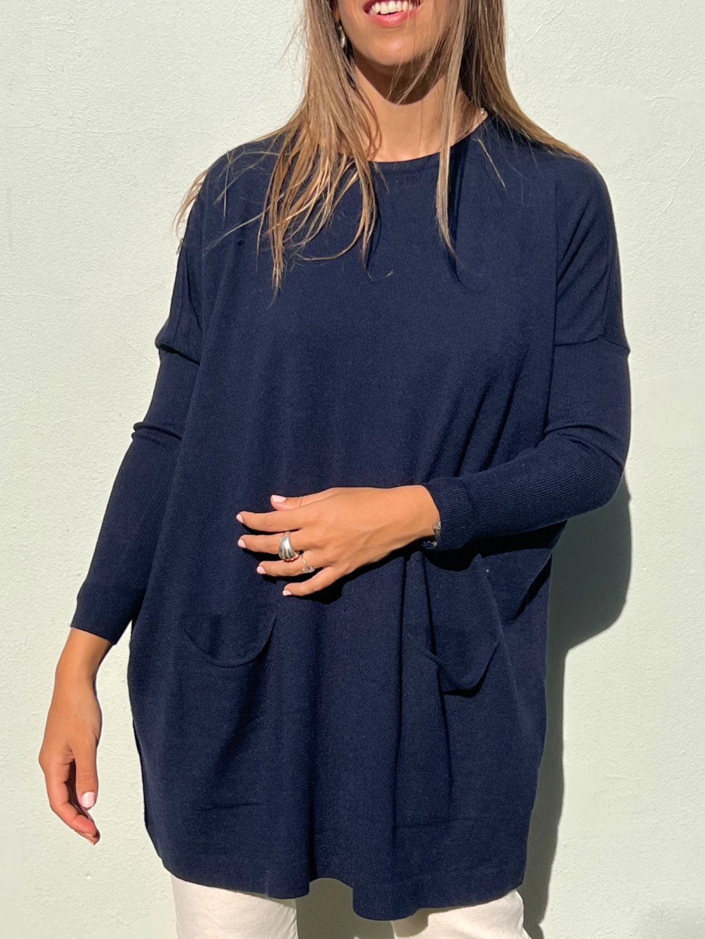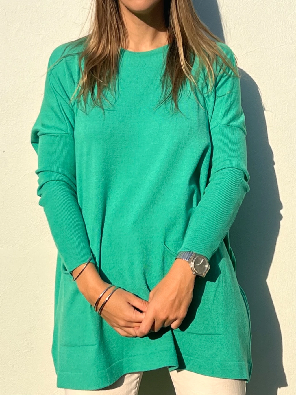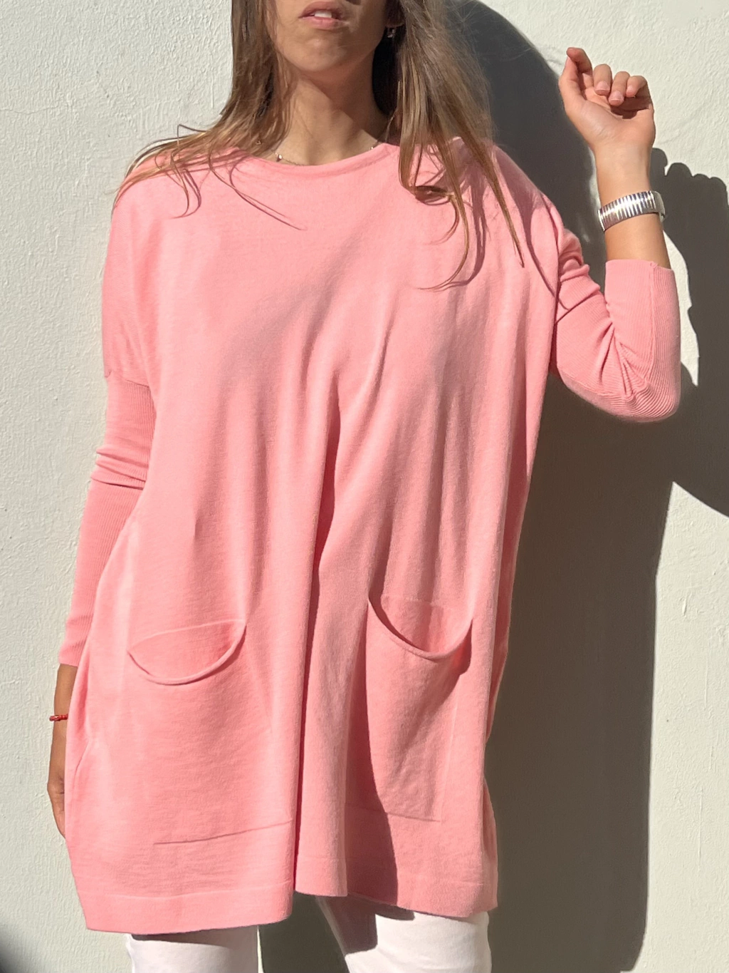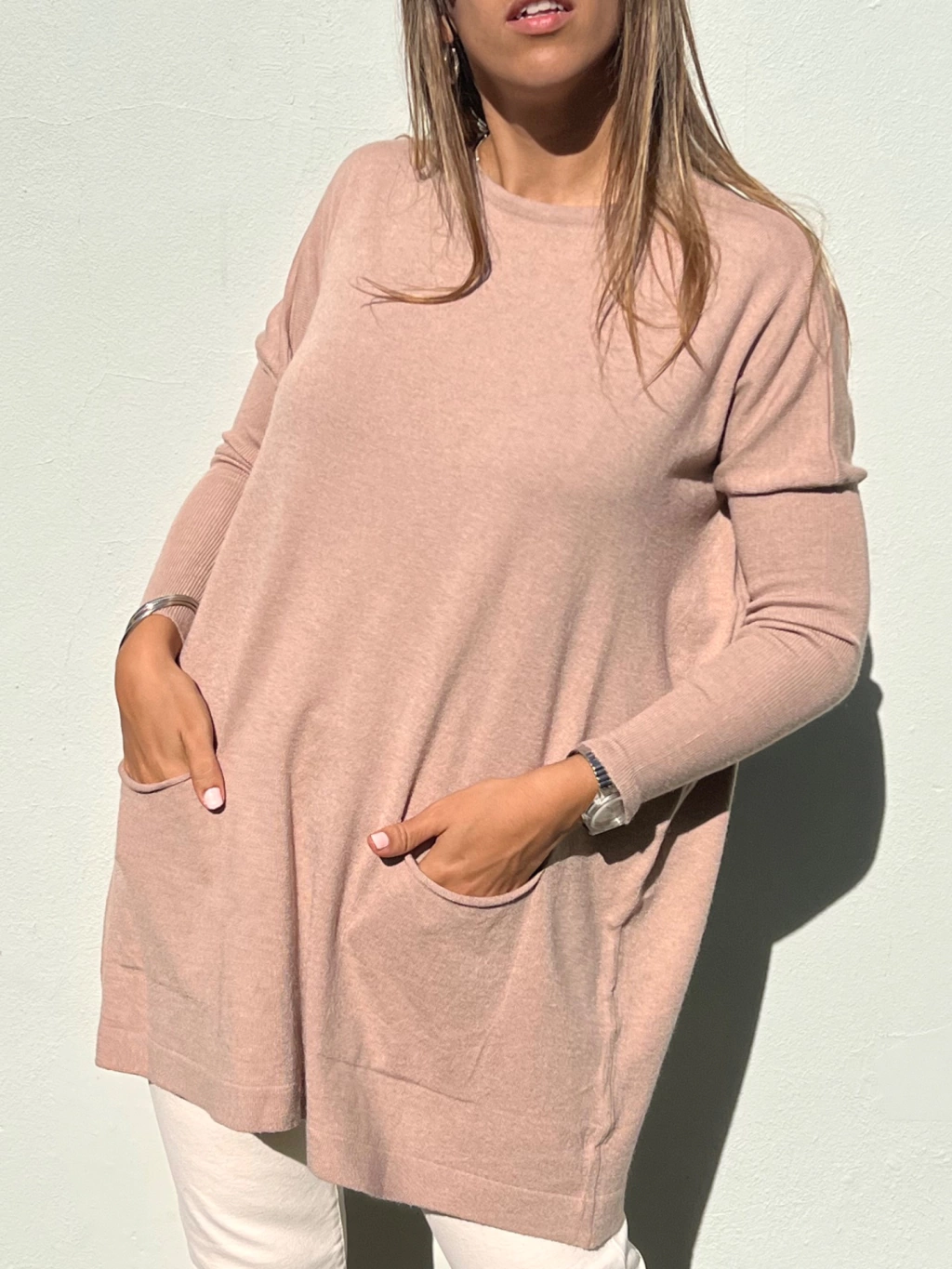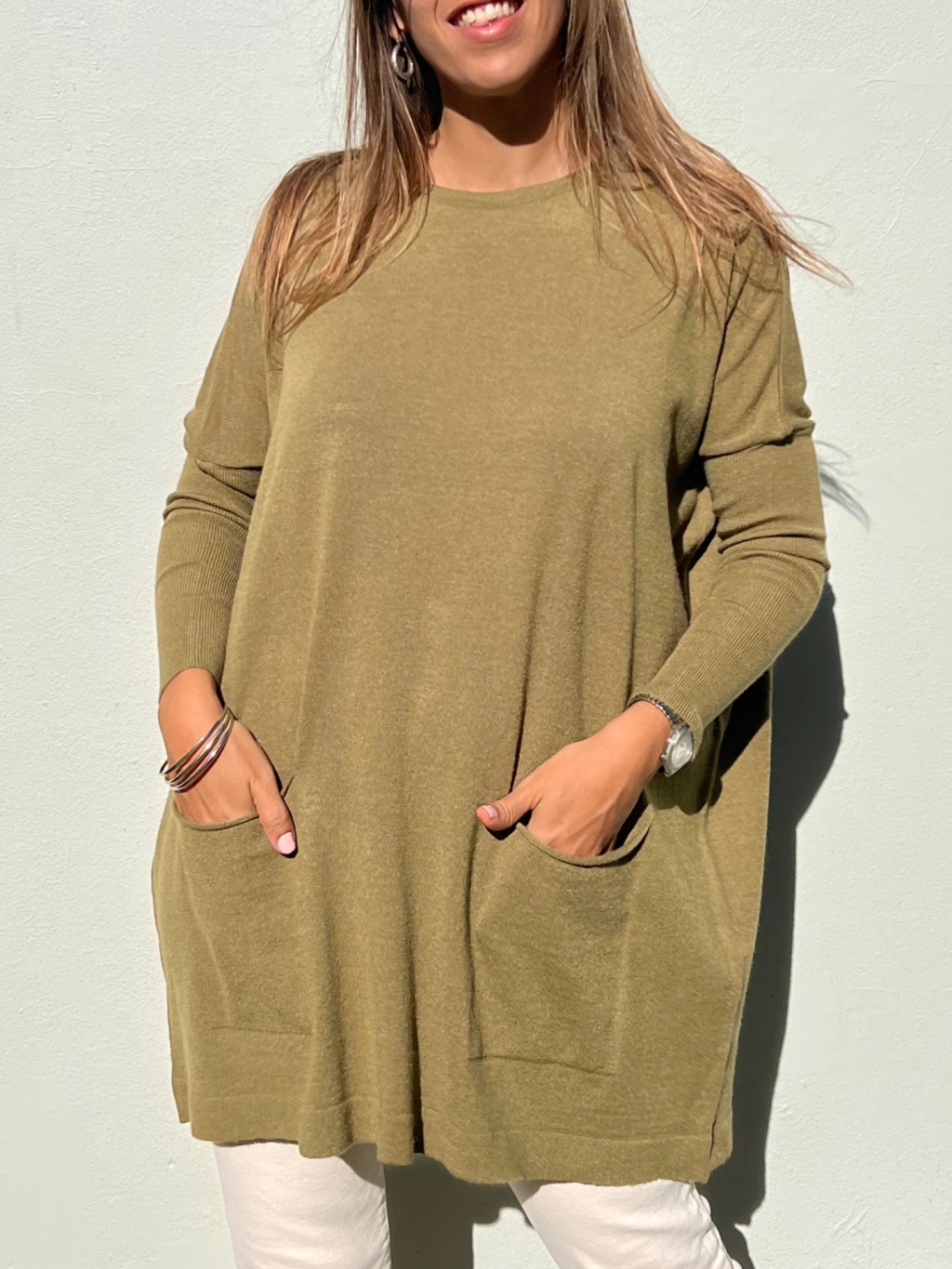 Sweater estilo oversized con bolsillos TALLE ÚNICO tejido hilo Bremer. Las mangas del antebrazo son suaves y ceden, ajustandose y moldeandose a tu antebrazo.
