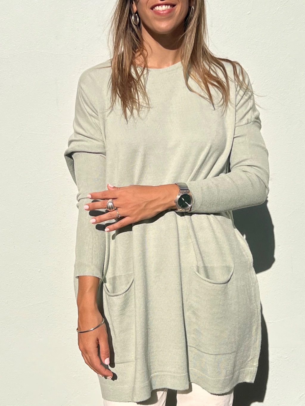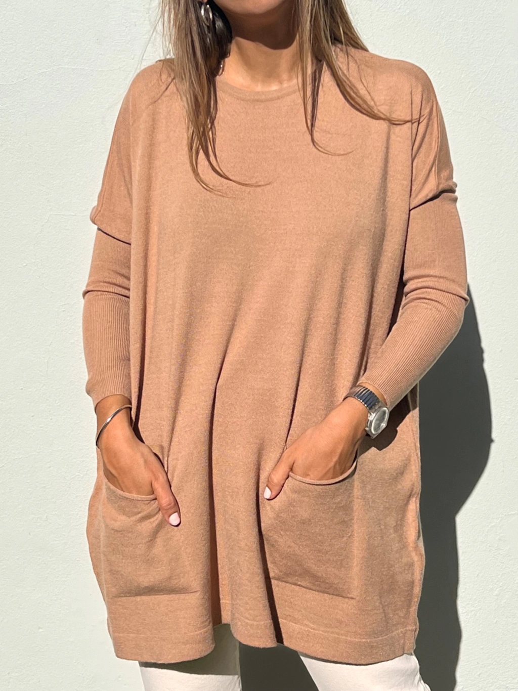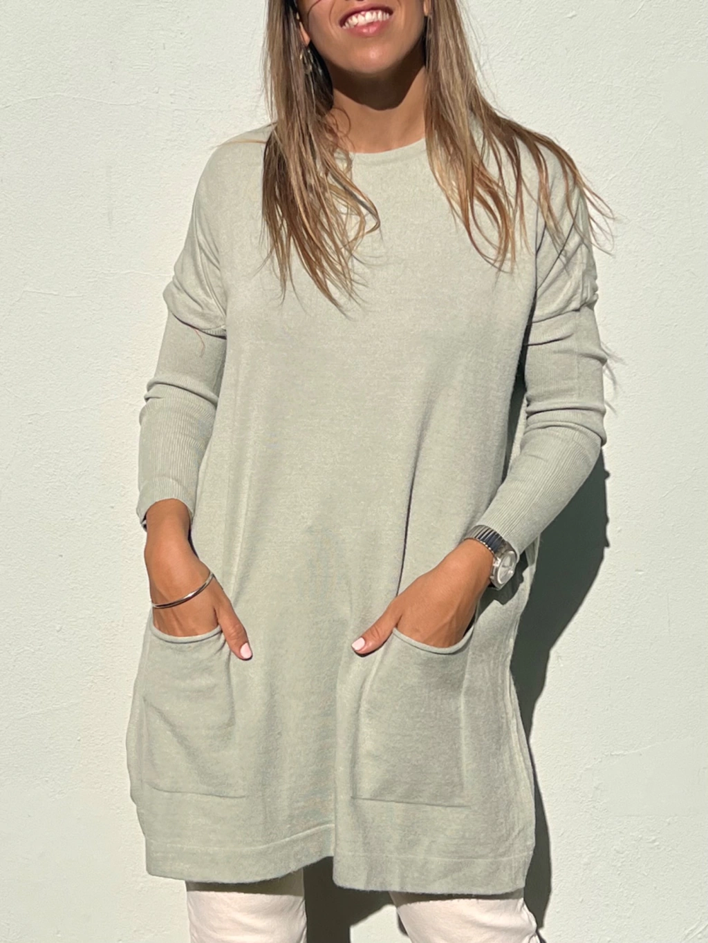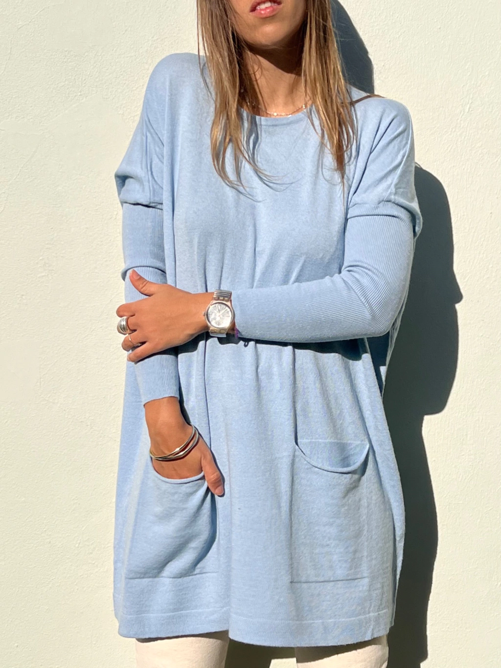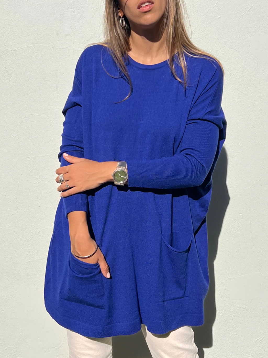 Sweater estilo oversized con bolsillos TALLE ÚNICO tejido hilo Bremer. Las mangas del antebrazo son suaves y ceden, ajustandose y moldeandose a tu antebrazo.