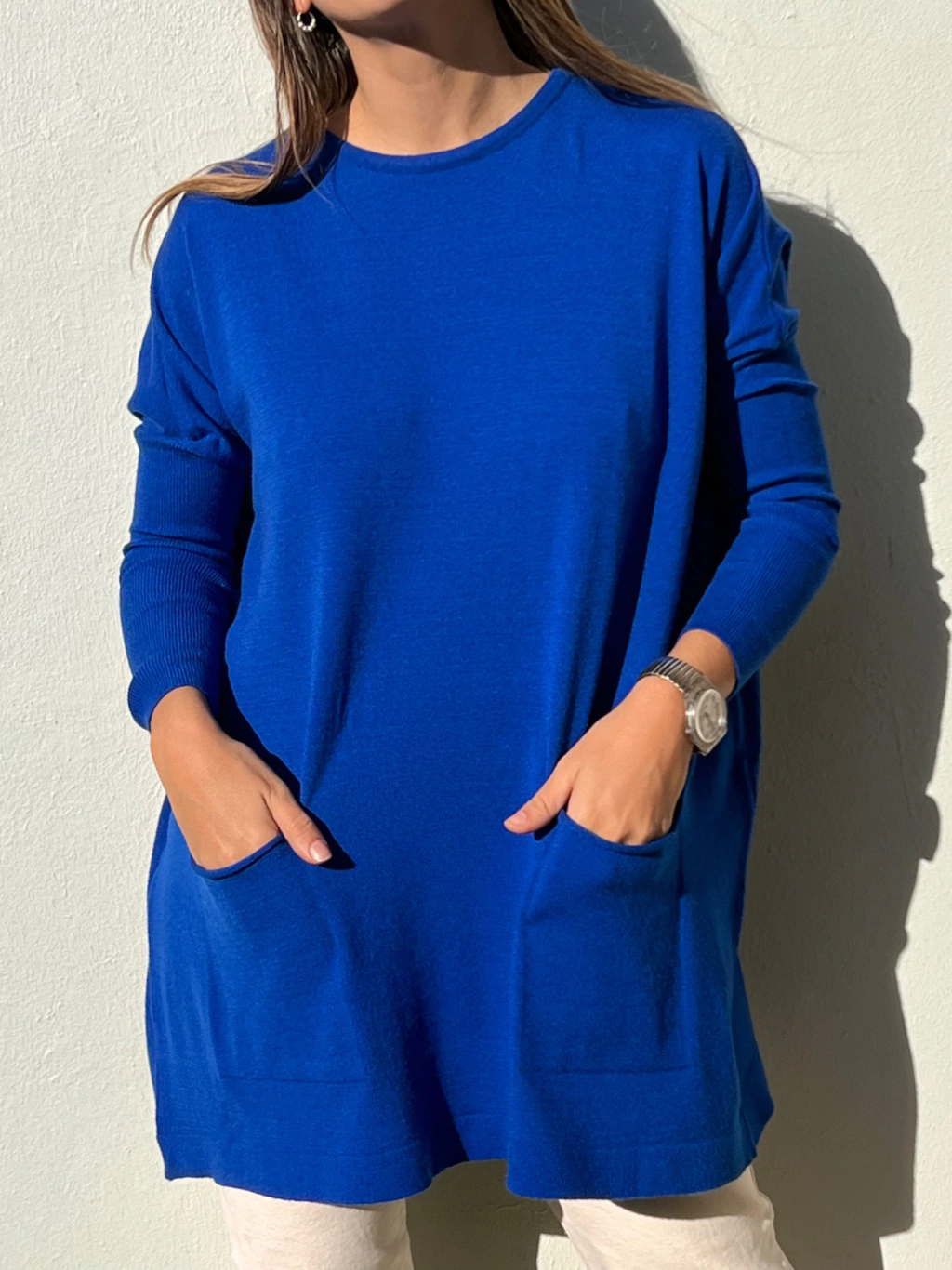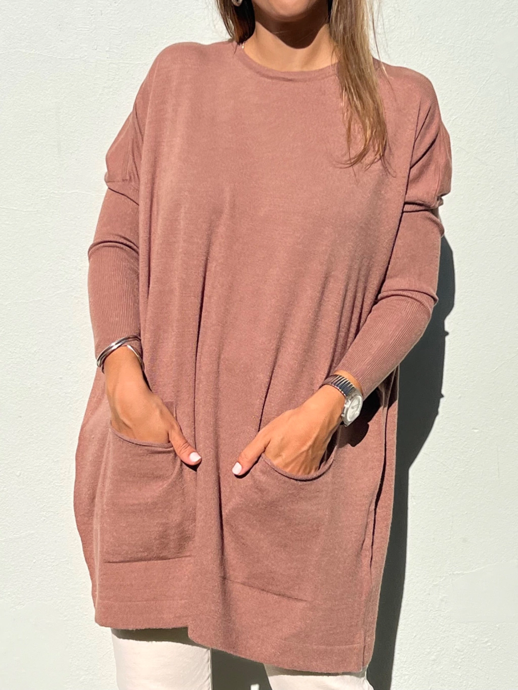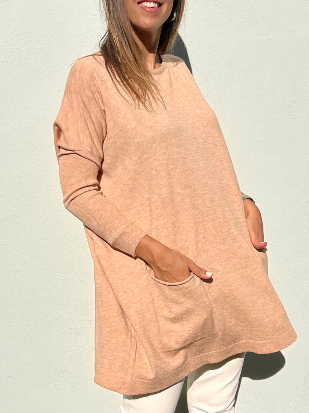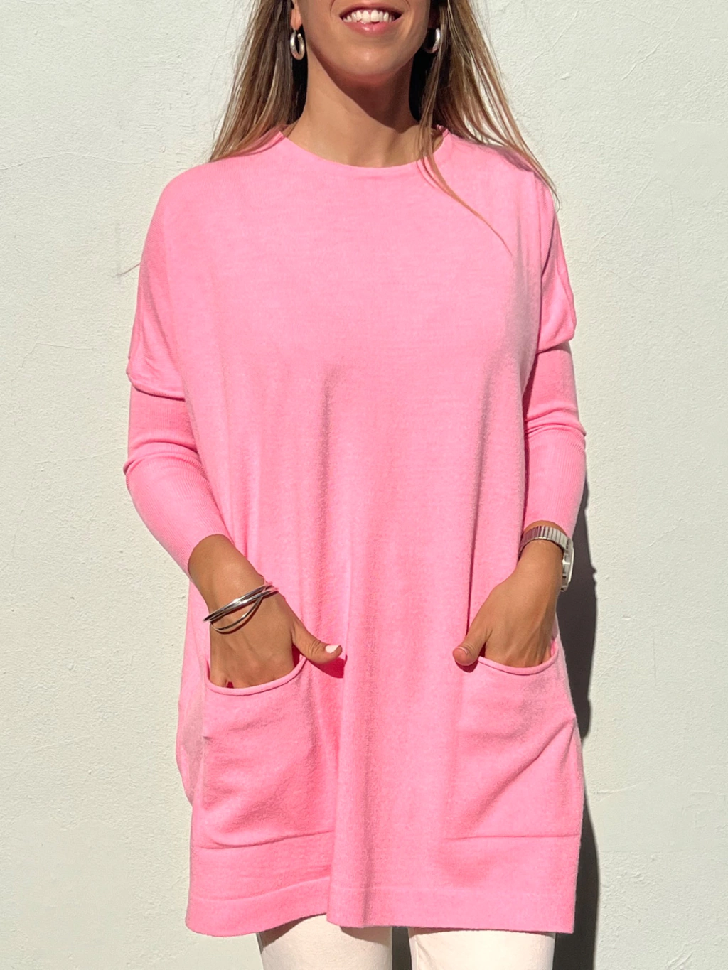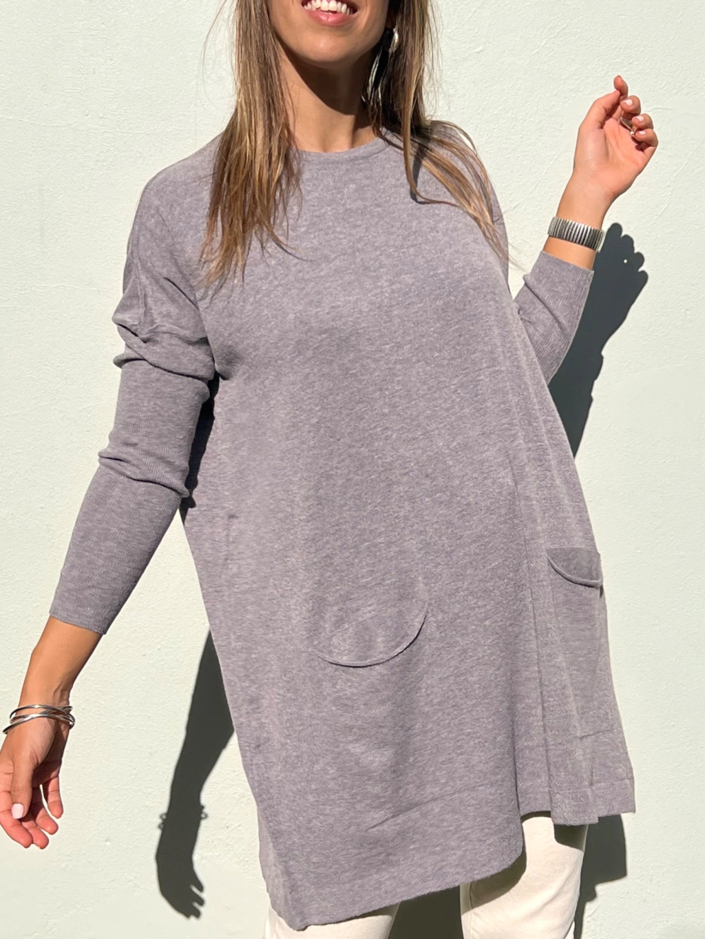 Sweater estilo oversized con bolsillos TALLE ÚNICO tejido hilo Bremer. Las mangas del antebrazo son suaves y ceden, ajustandose y moldeandose a tu antebrazo.