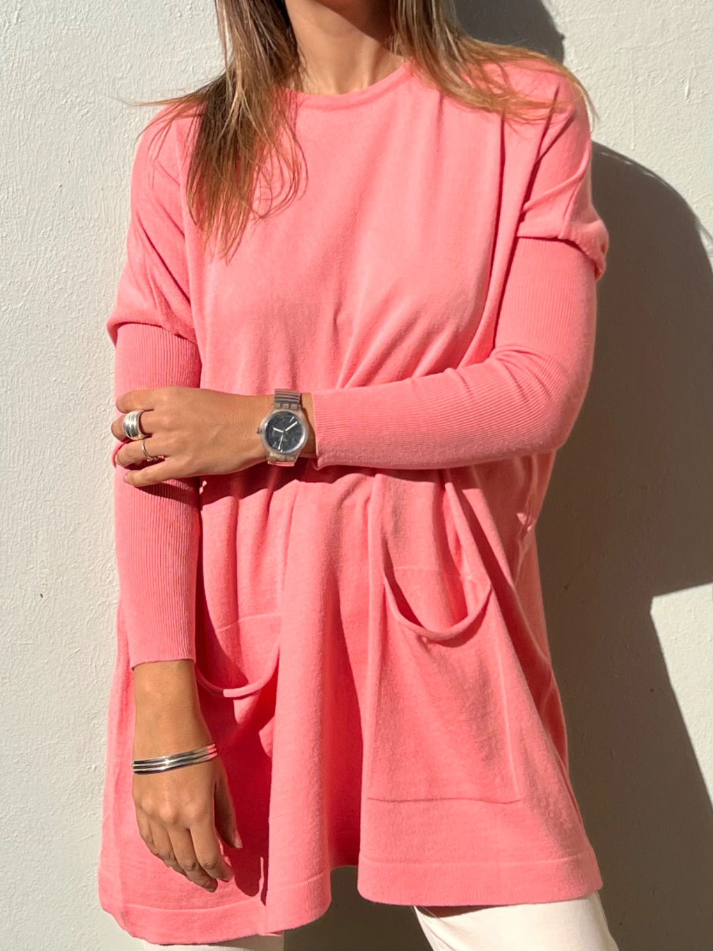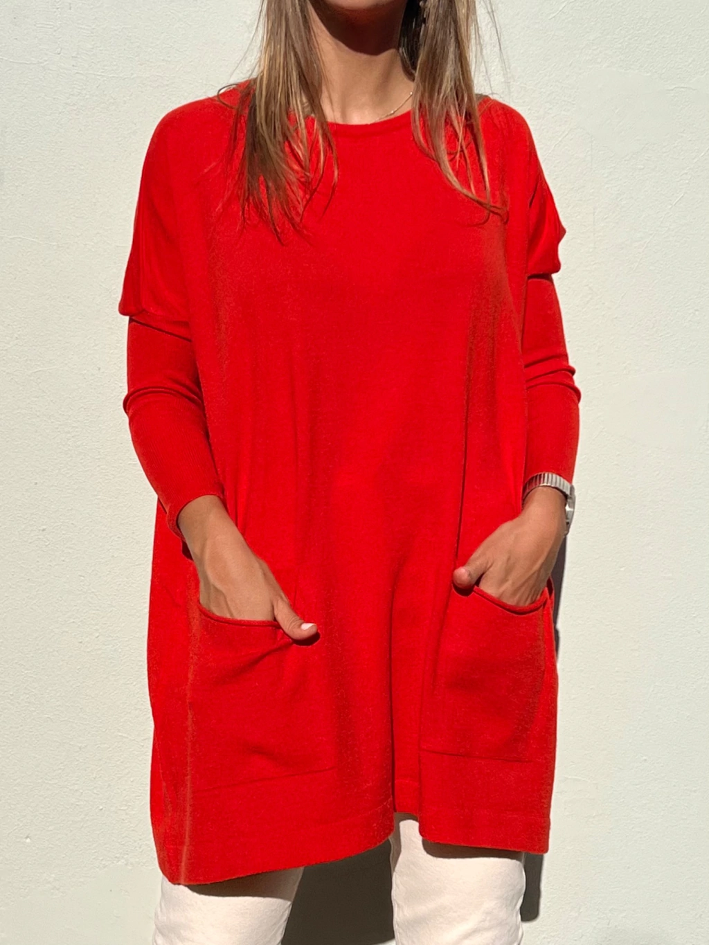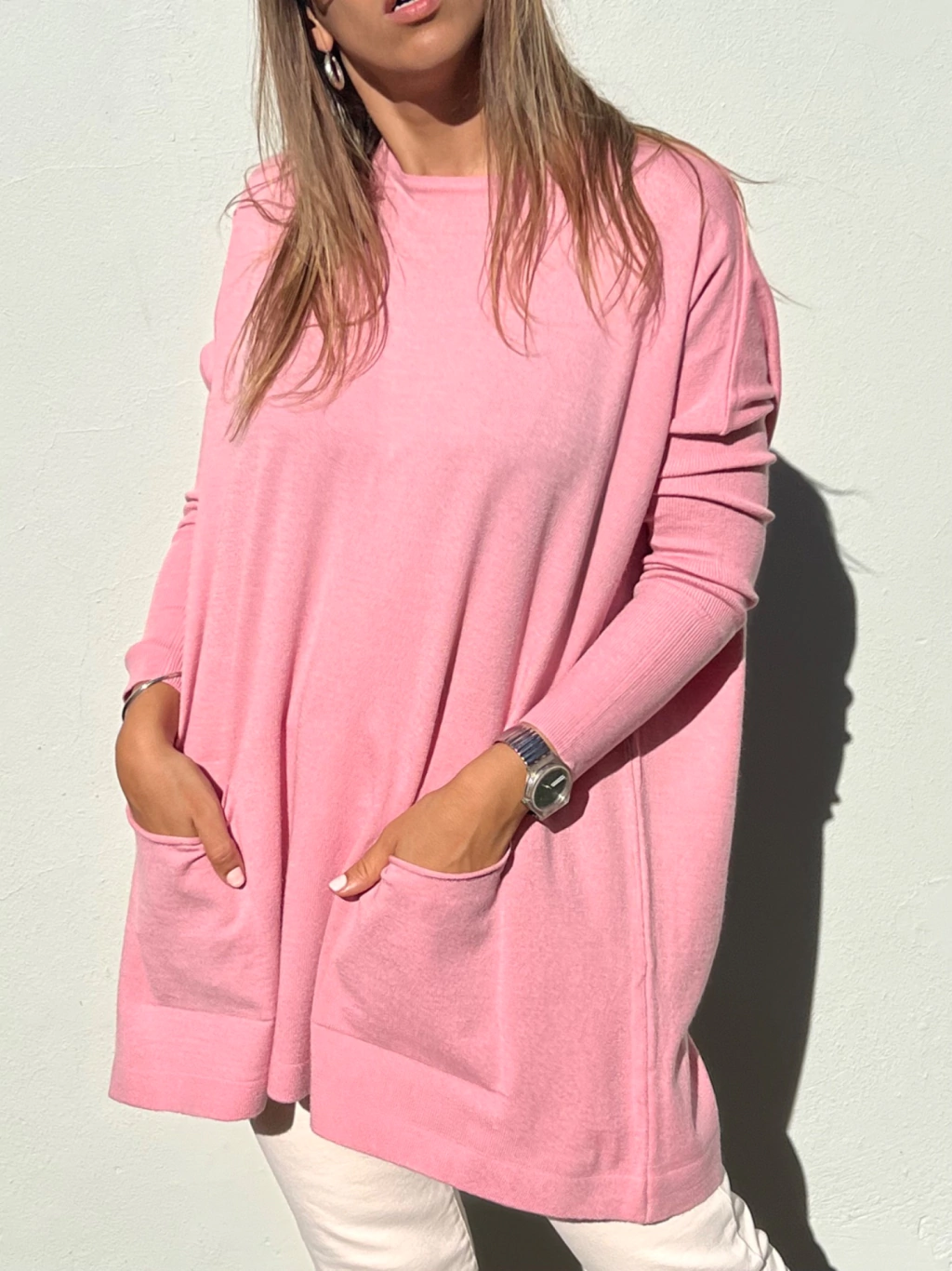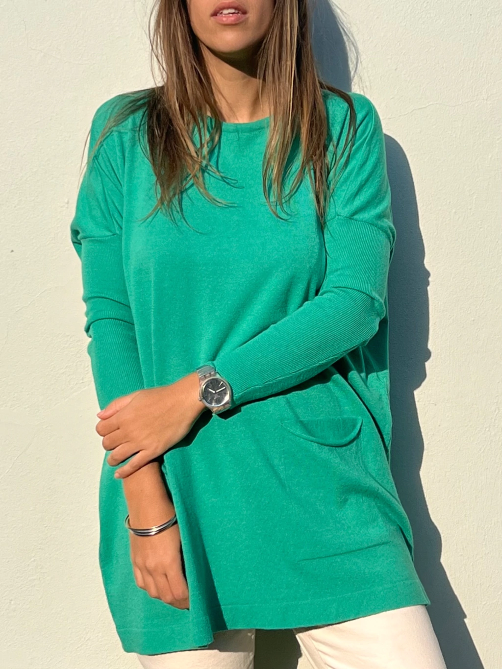 Sweater estilo oversized con bolsillos TALLE ÚNICO tejido hilo Bremer. Las mangas del antebrazo son suaves y ceden, ajustandose y moldeandose a tu antebrazo.