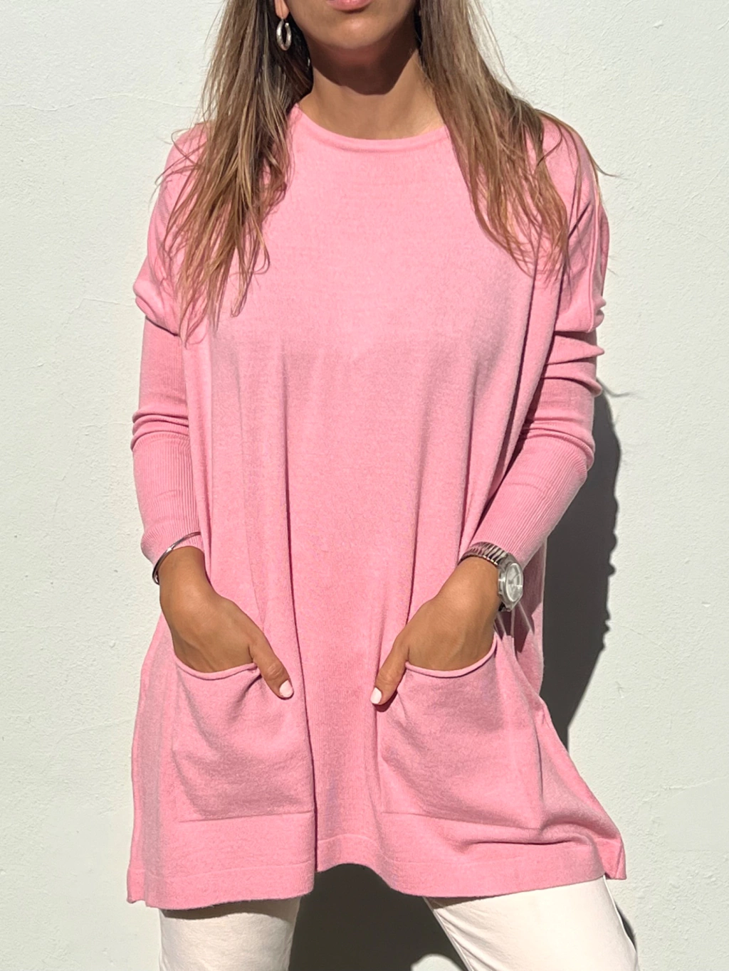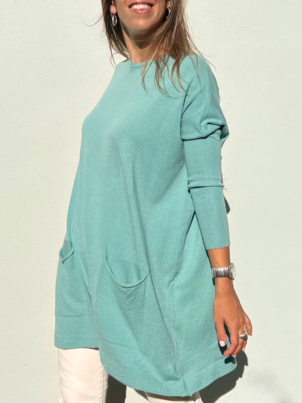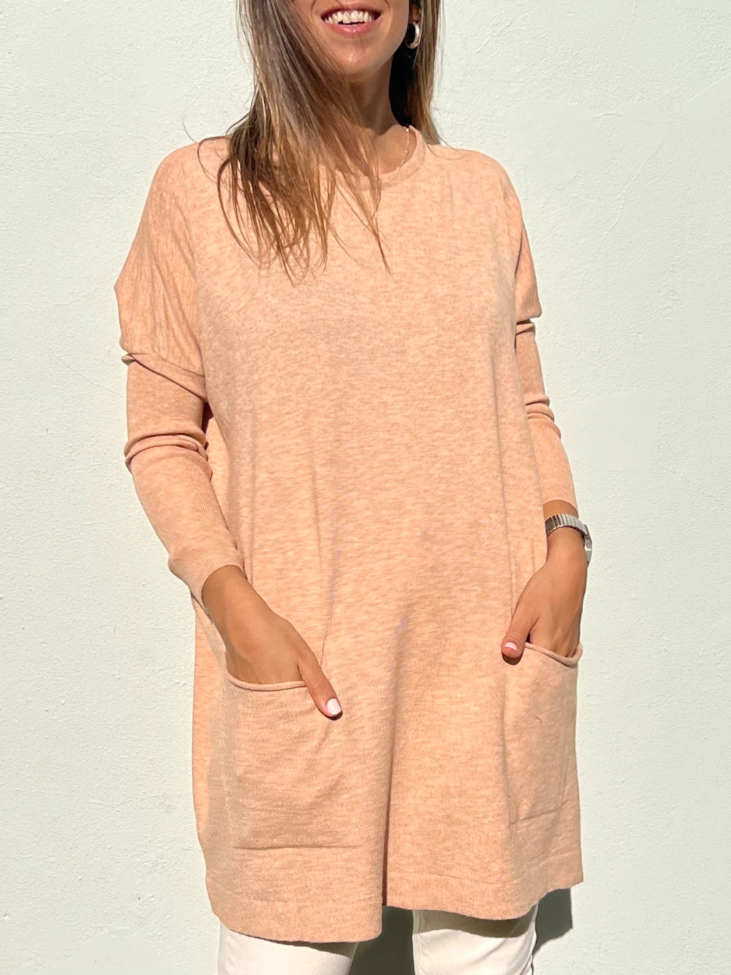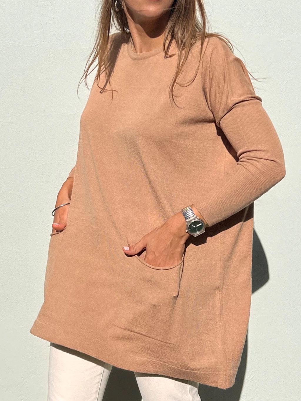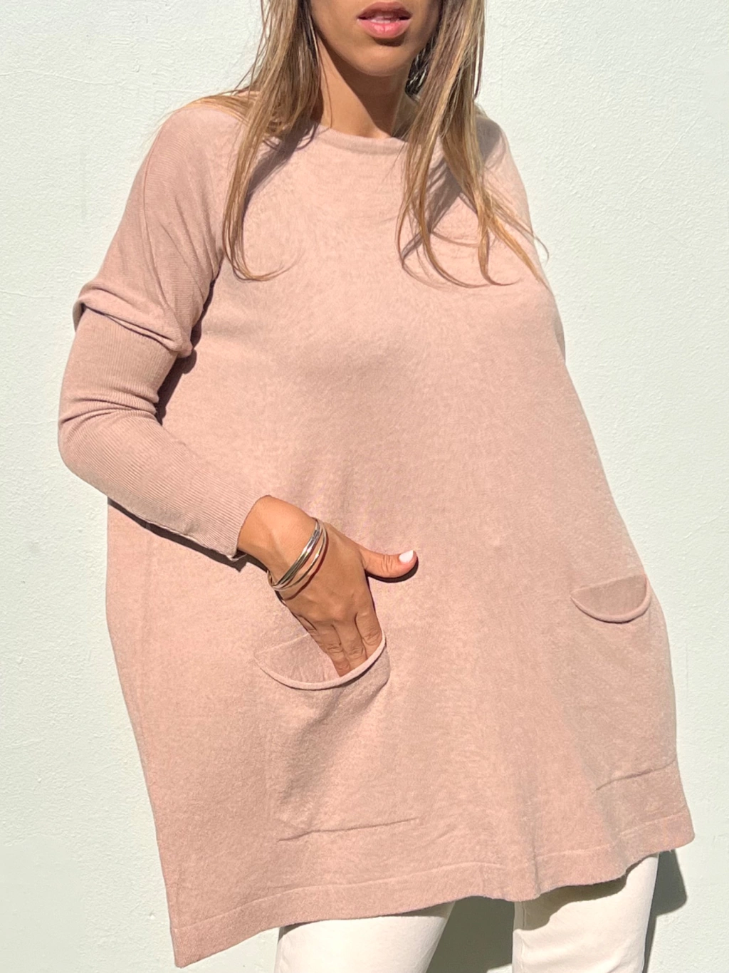 Sweater estilo oversized con bolsillos TALLE ÚNICO tejido hilo Bremer. Las mangas del antebrazo son suaves y ceden, ajustandose y moldeandose a tu antebrazo.