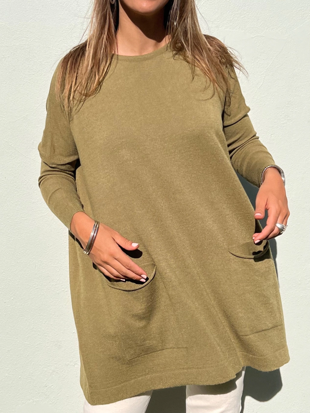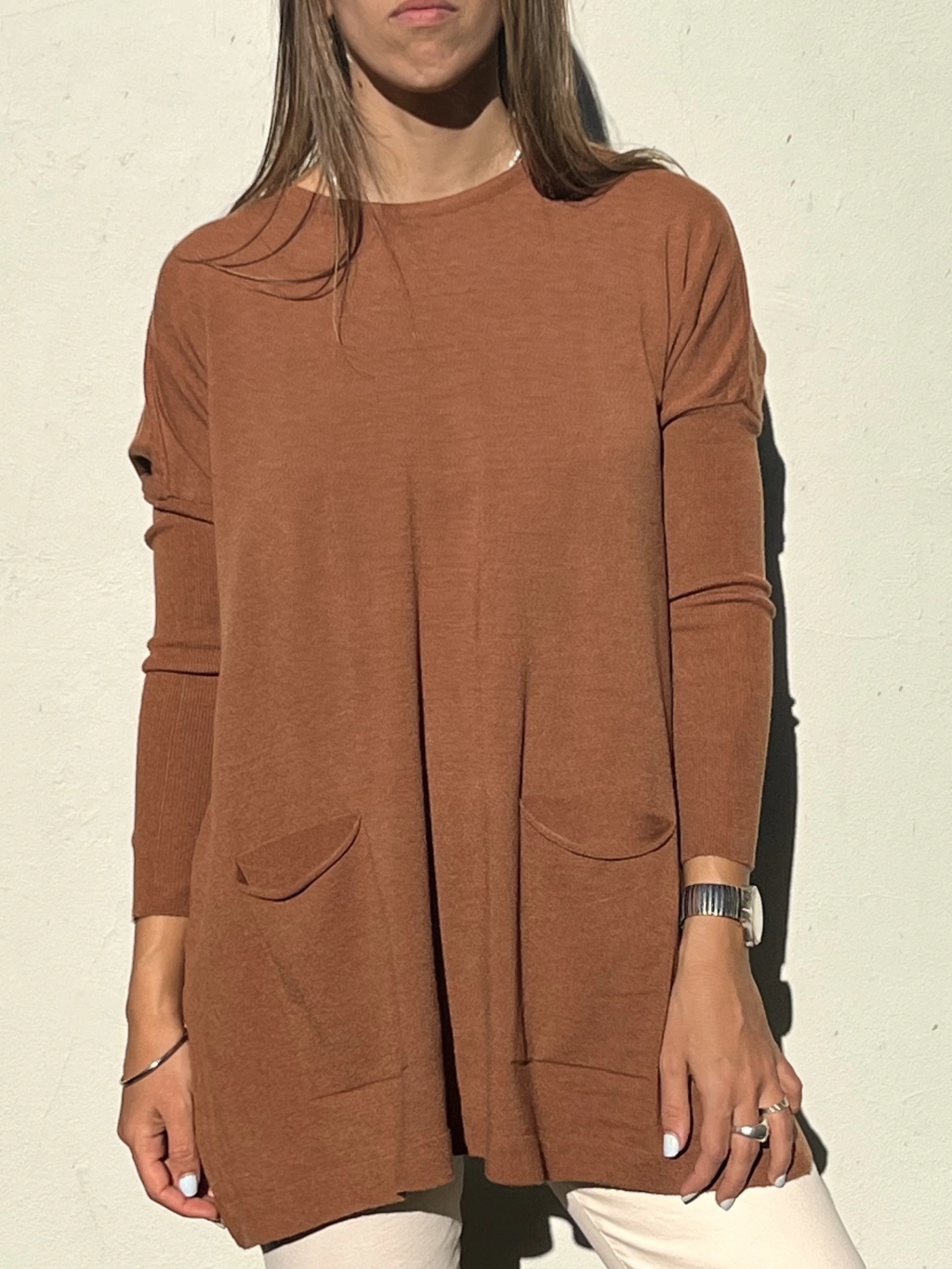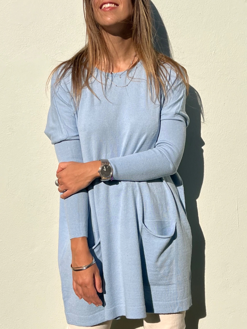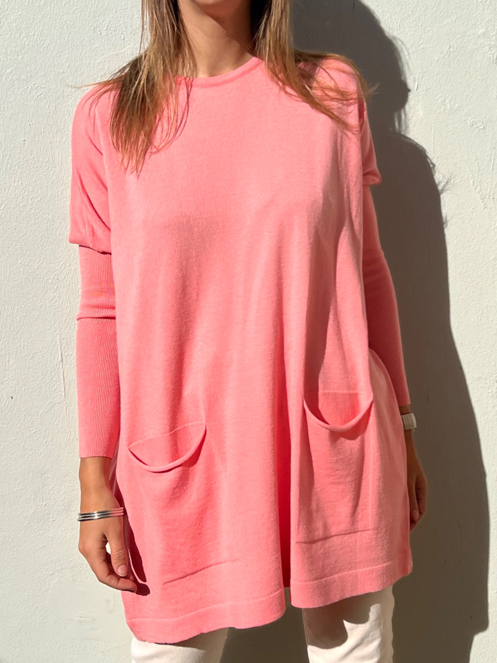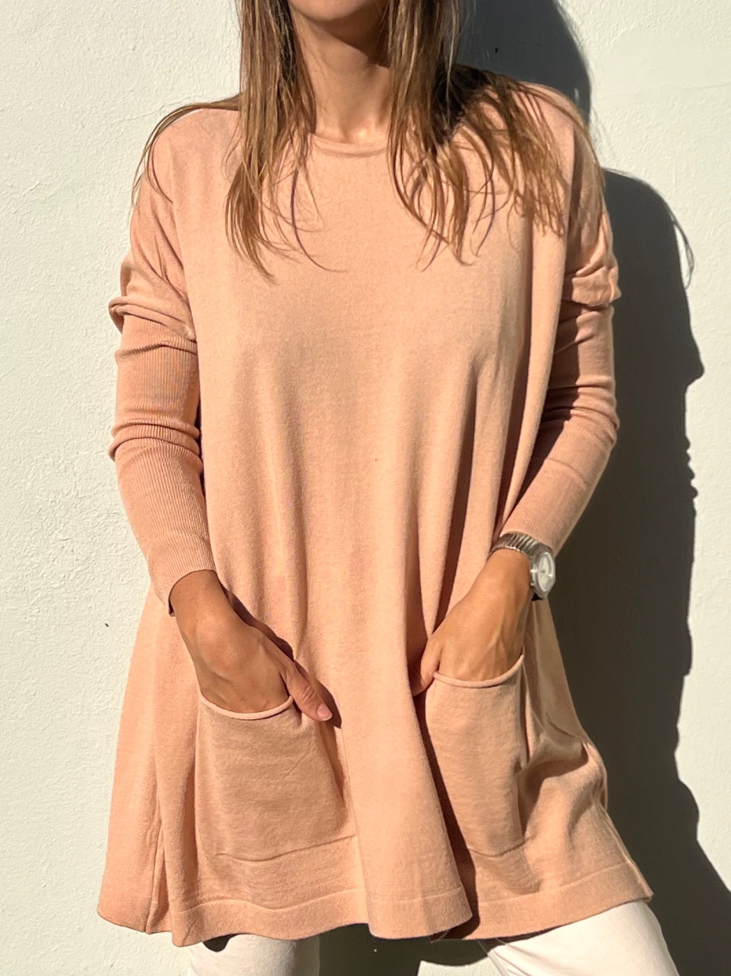 Sweater estilo oversized con bolsillos TALLE ÚNICO tejido hilo Bremer. Las mangas del antebrazo son suaves y ceden, ajustandose y moldeandose a tu antebrazo.