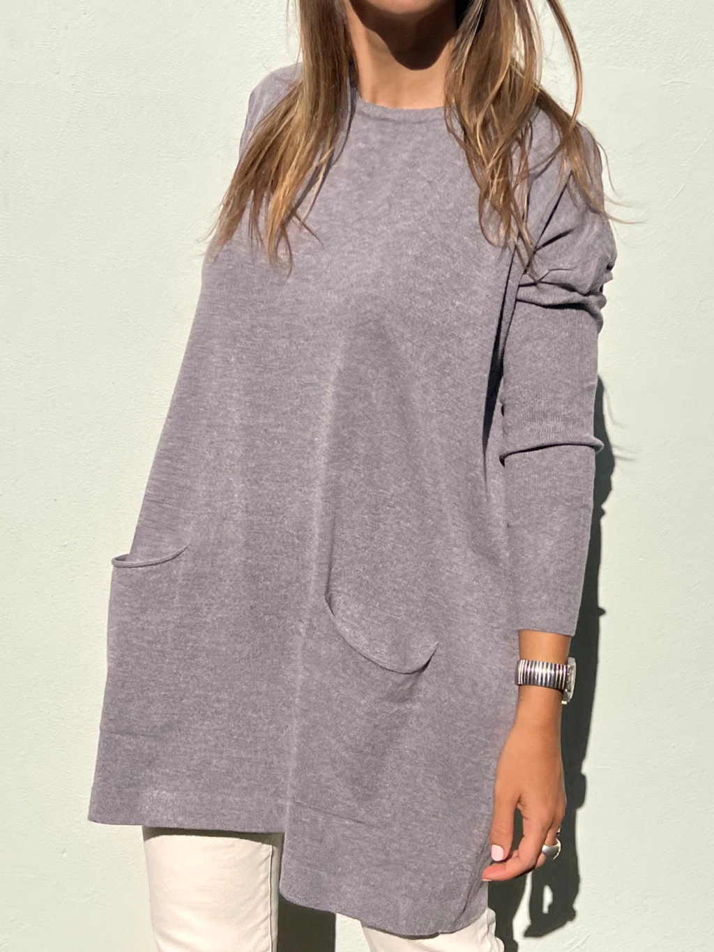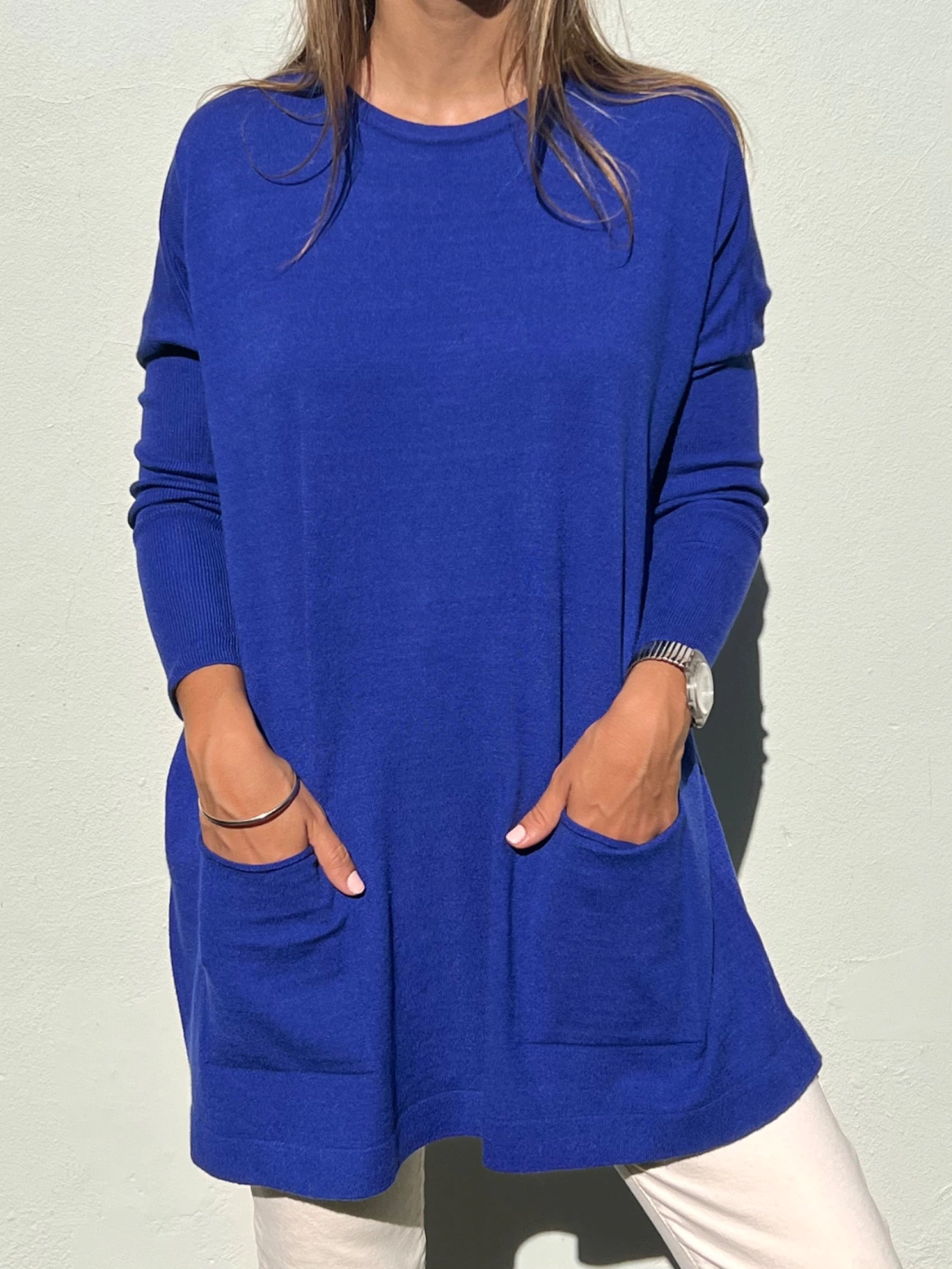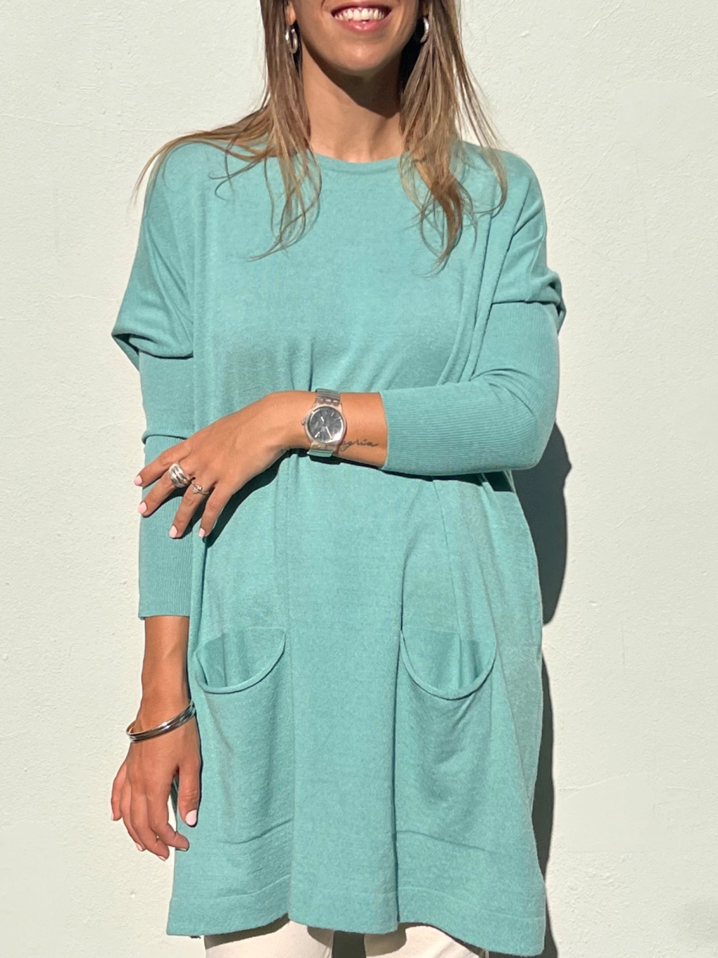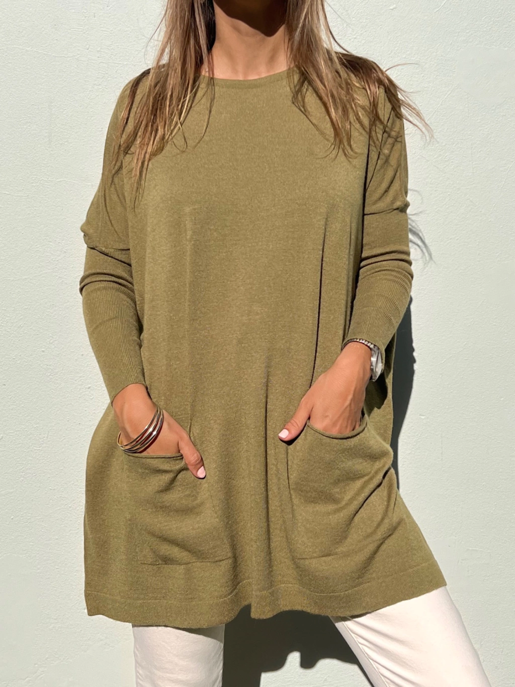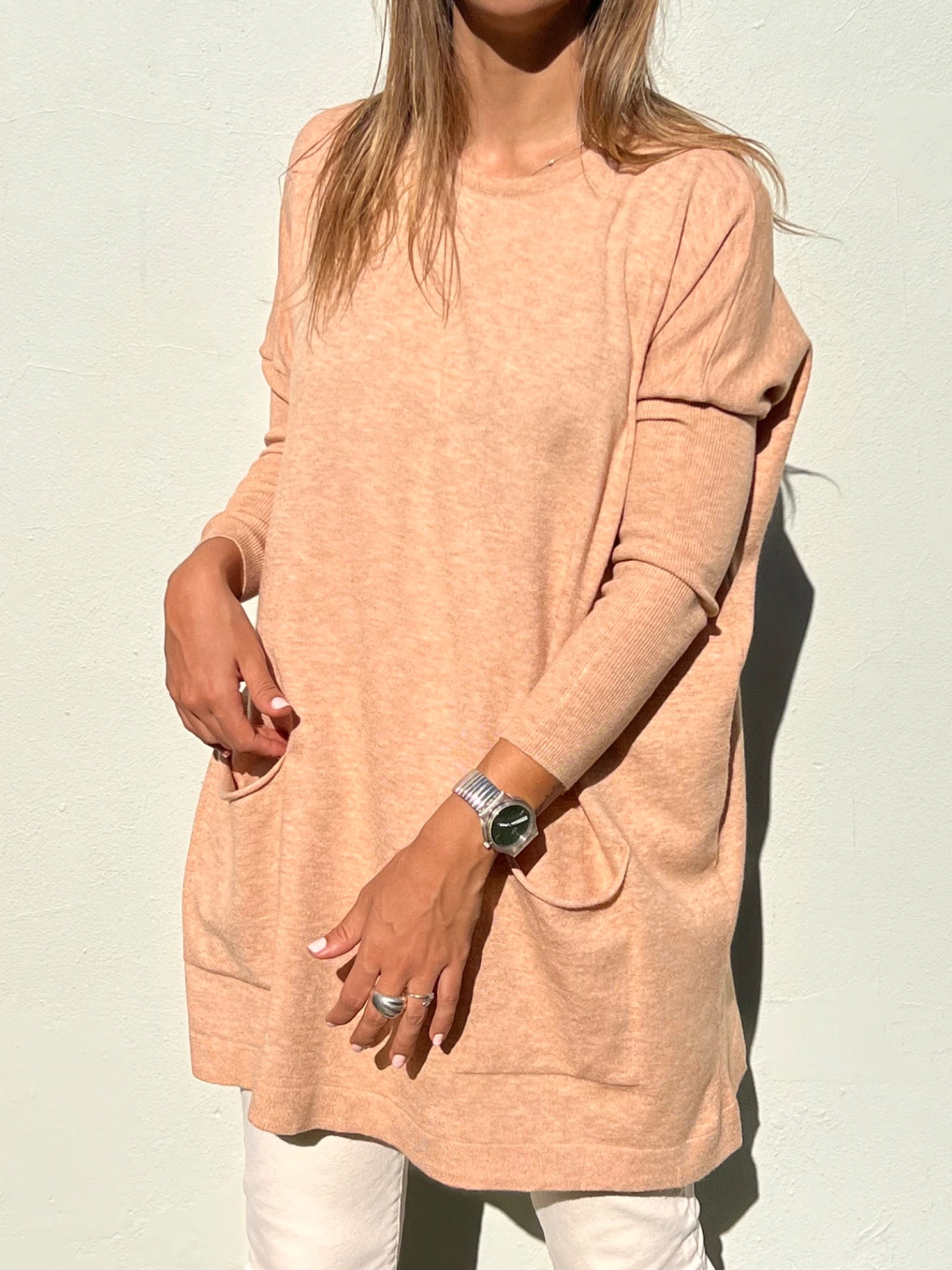 Sweater estilo oversized con bolsillos TALLE ÚNICO tejido hilo Bremer. Las mangas del antebrazo son suaves y ceden, ajustandose y moldeandose a tu antebrazo.
