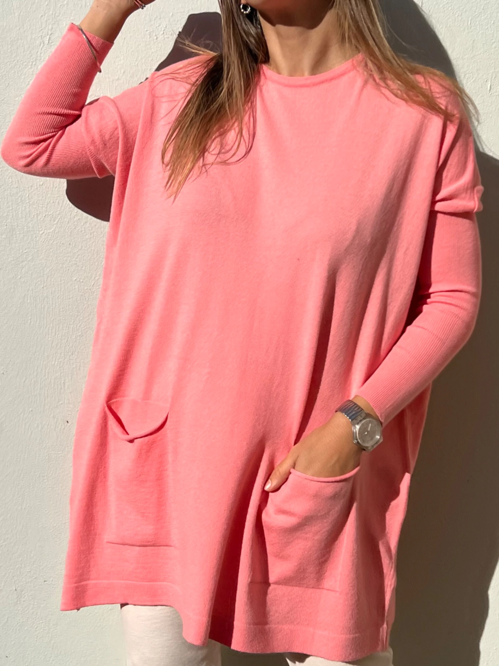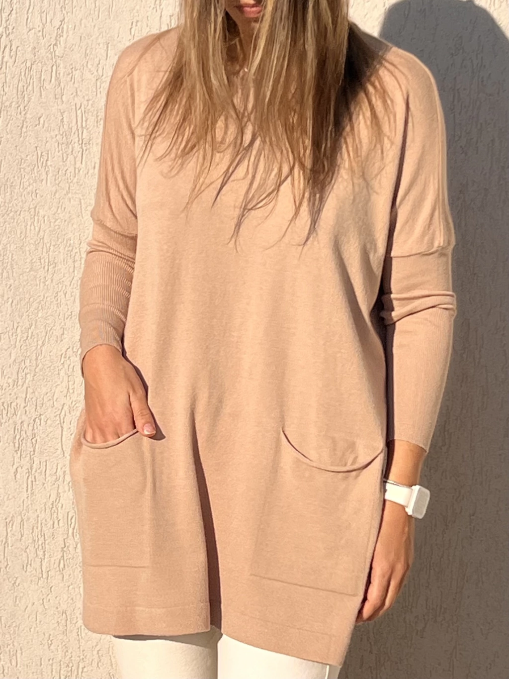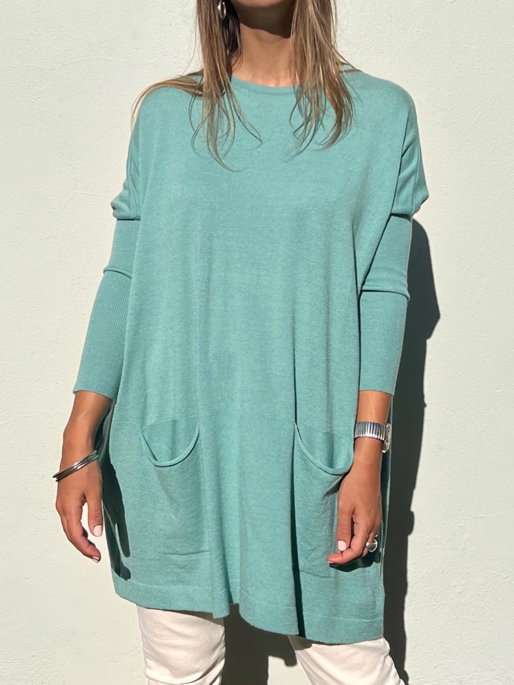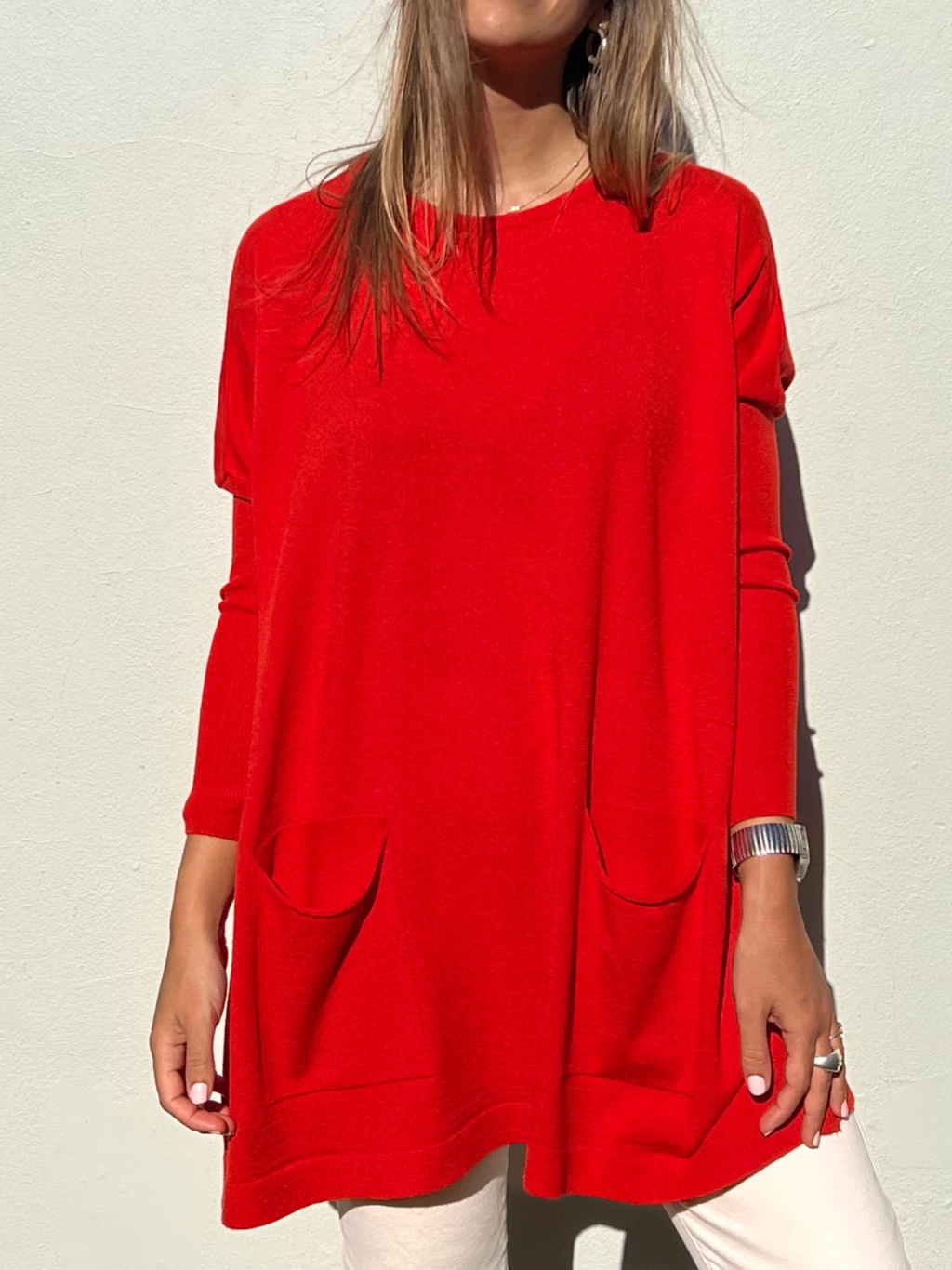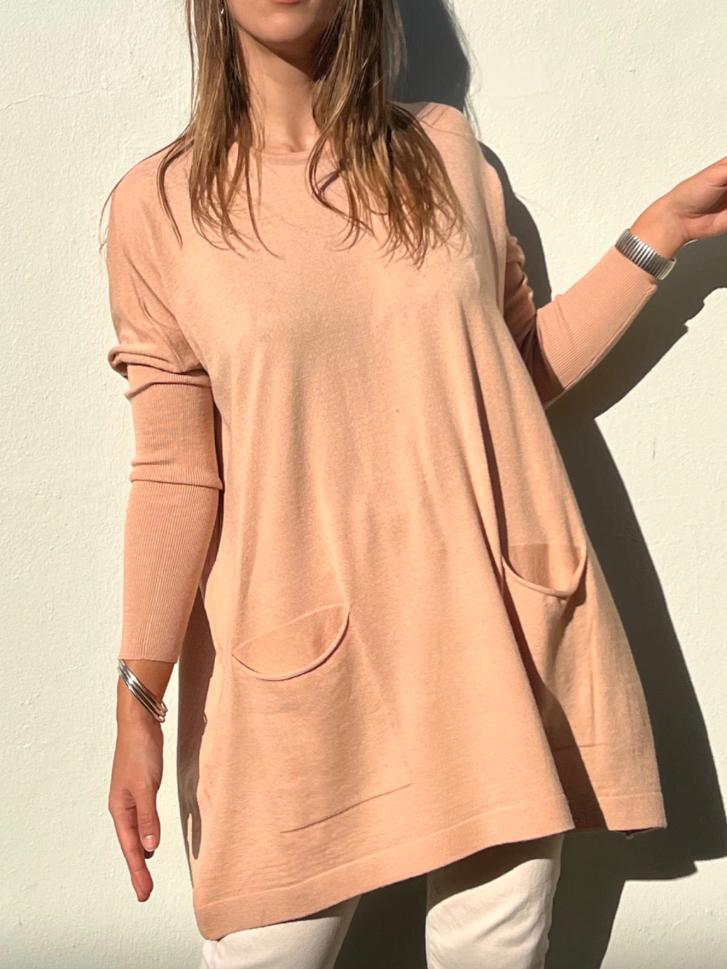 Sweater estilo oversized con bolsillos TALLE ÚNICO tejido hilo Bremer. Las mangas del antebrazo son suaves y ceden, ajustandose y moldeandose a tu antebrazo.