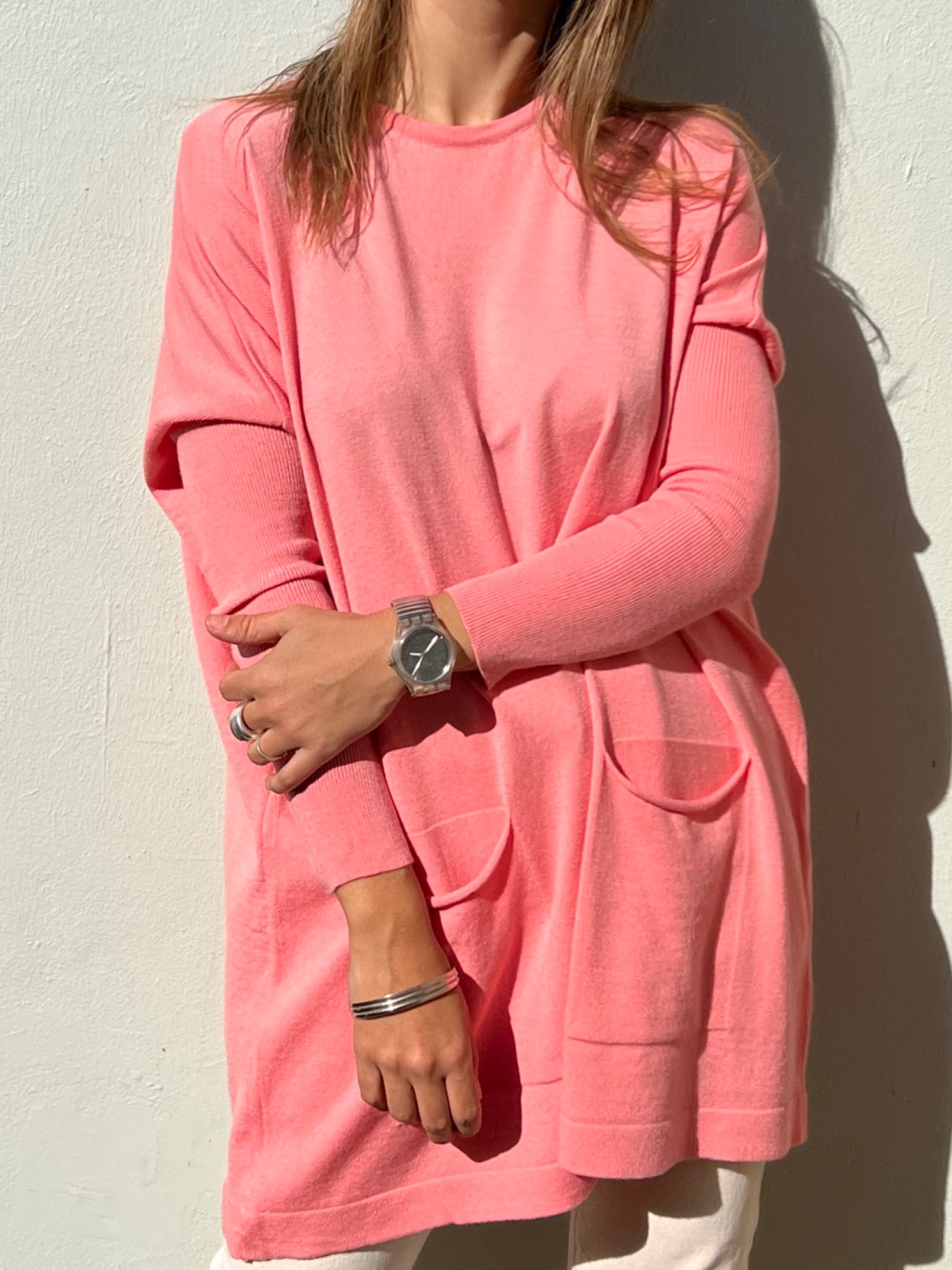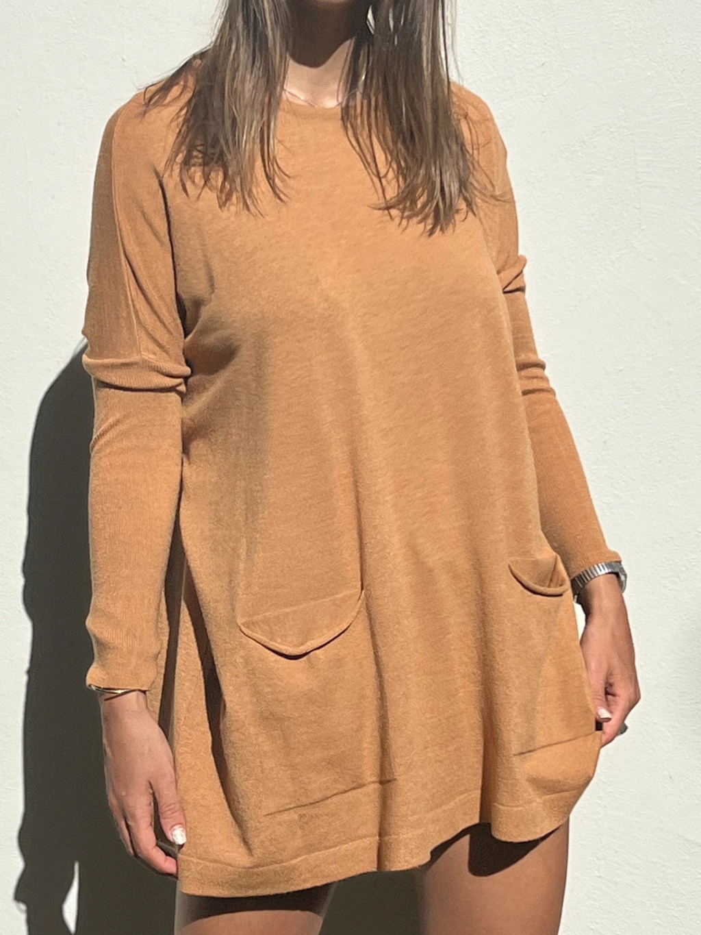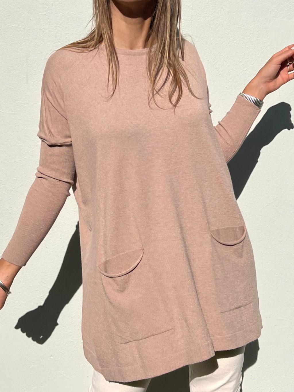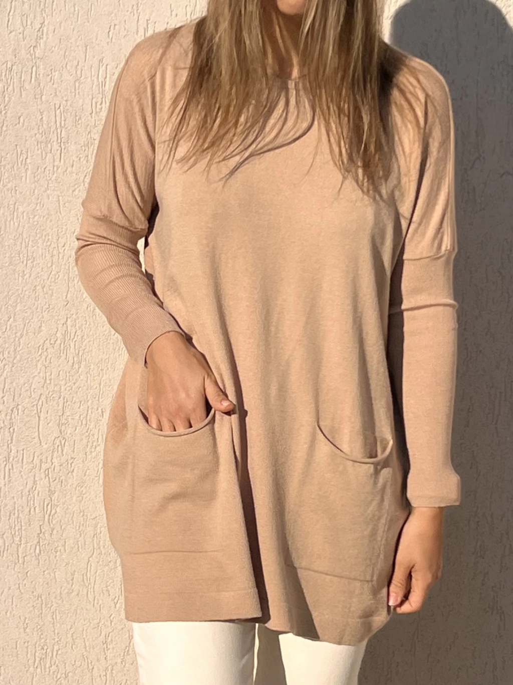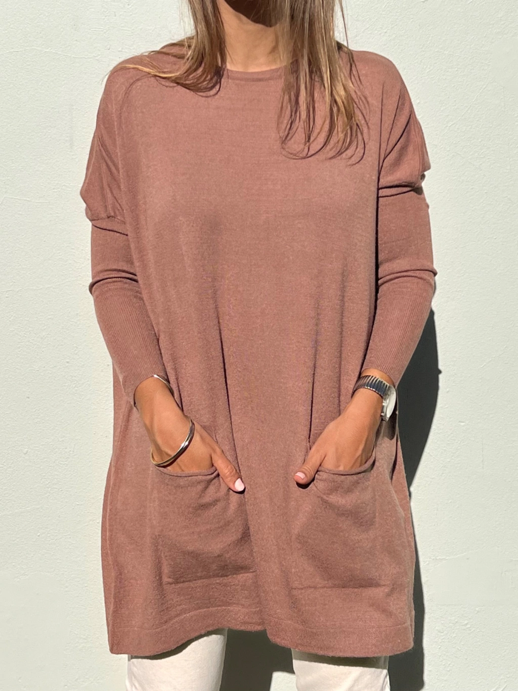 Sweater estilo oversized con bolsillos TALLE ÚNICO tejido hilo Bremer. Las mangas del antebrazo son suaves y ceden, ajustandose y moldeandose a tu antebrazo.