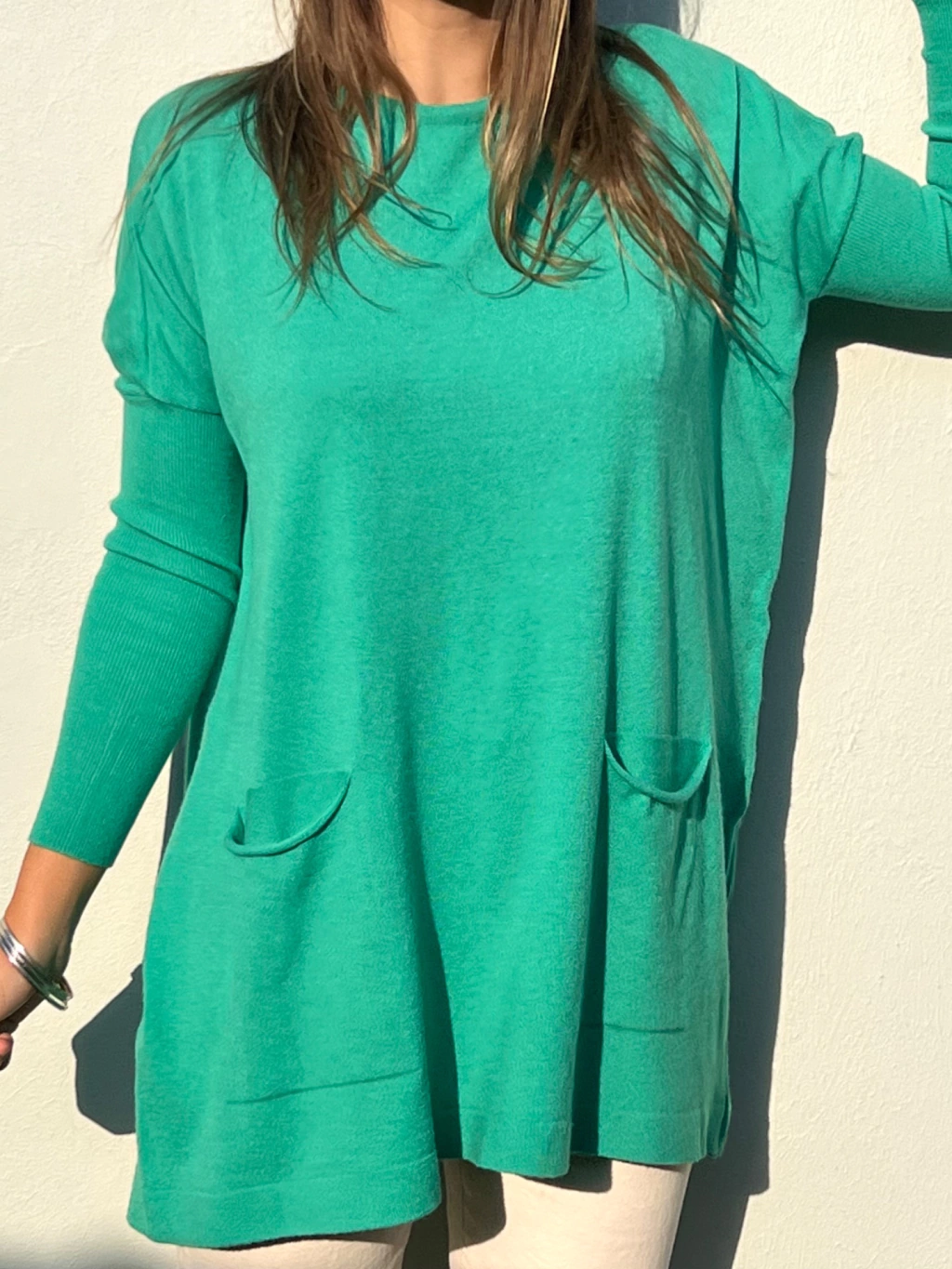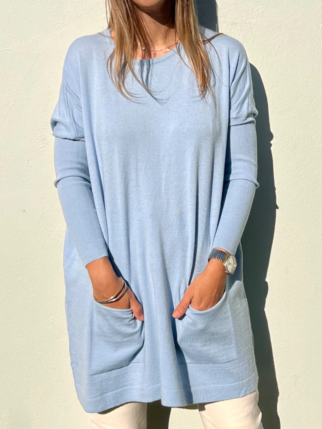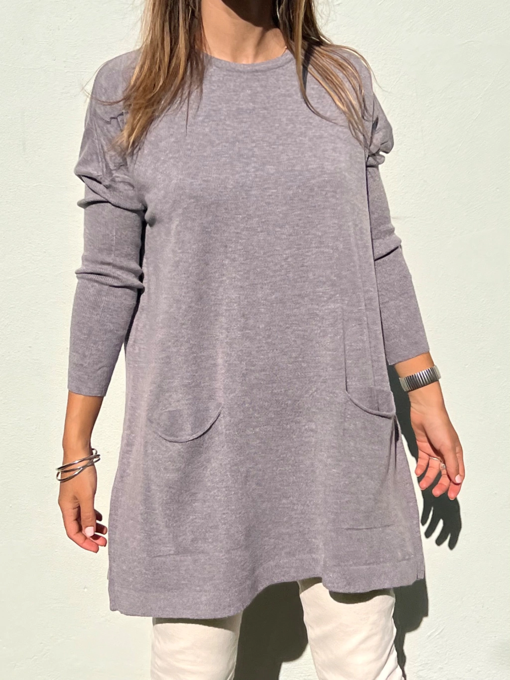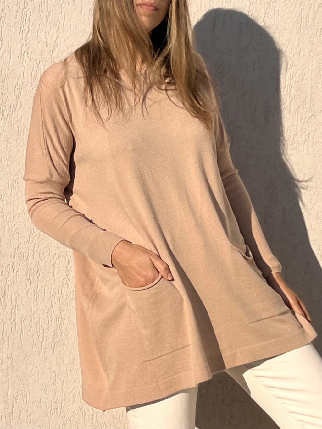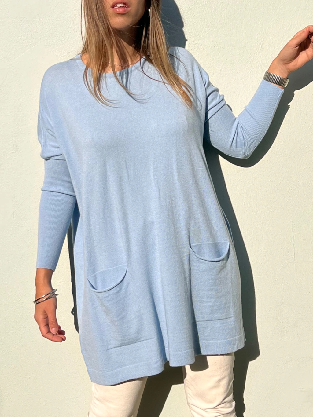 Sweater estilo oversized con bolsillos TALLE ÚNICO tejido hilo Bremer. Las mangas del antebrazo son suaves y ceden, ajustandose y moldeandose a tu antebrazo.