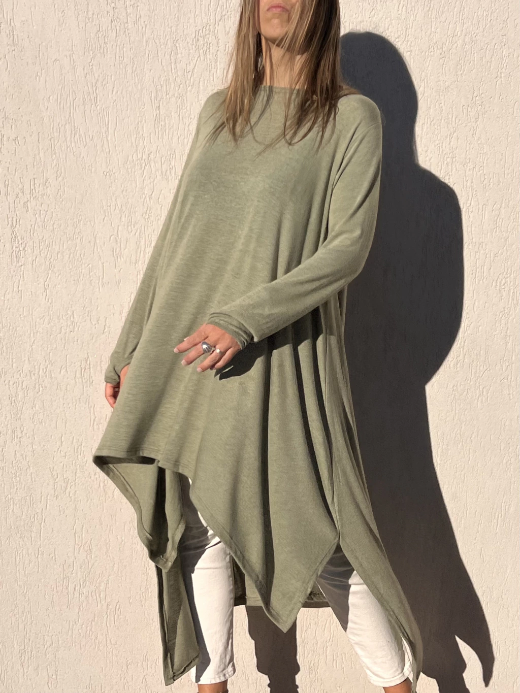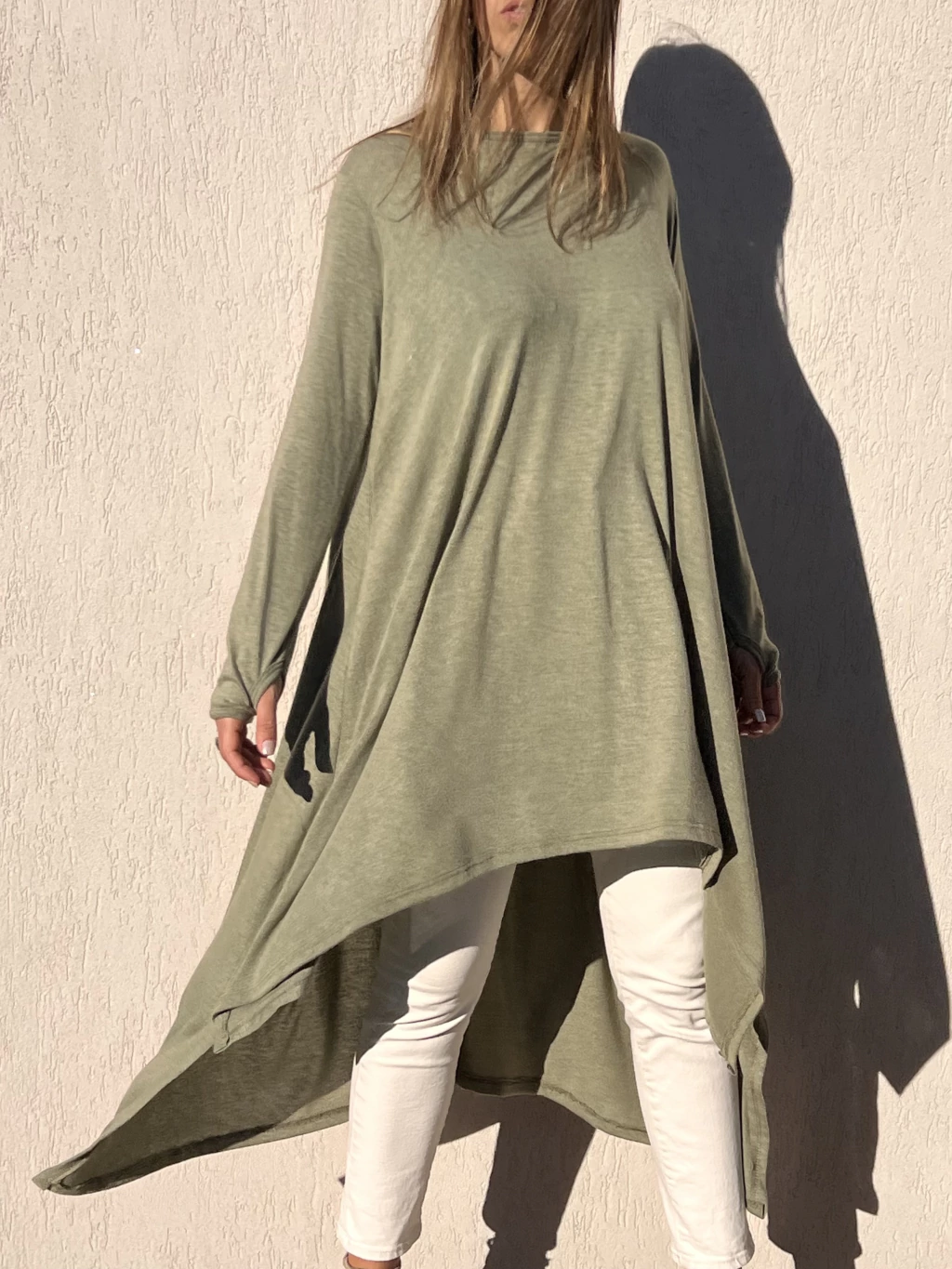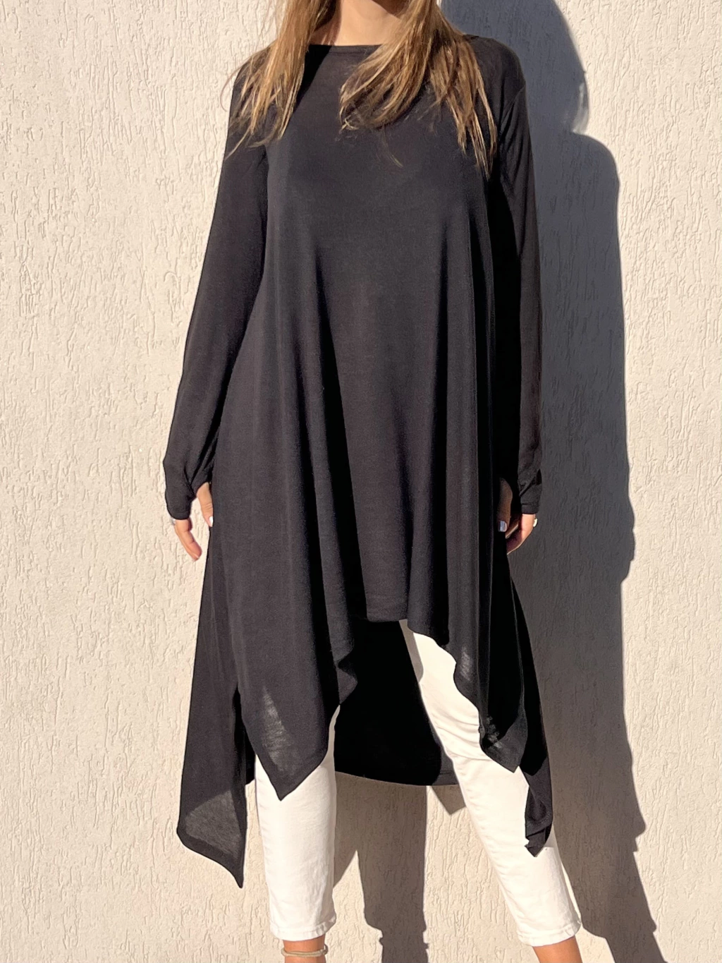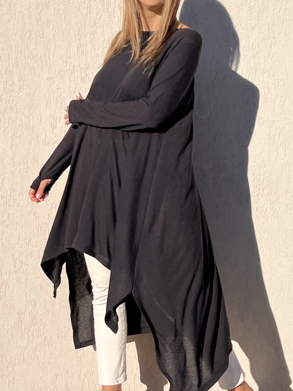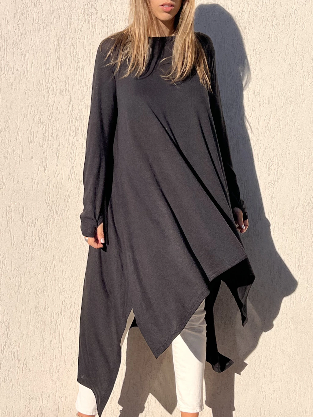 Vestido amplio largo con Terminación en puntas laterales. Con pasa pulgares. Confeccionado en Lanilla Viscosa de alta calidad.
