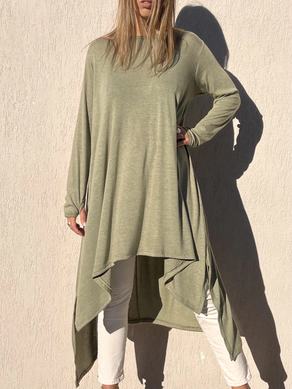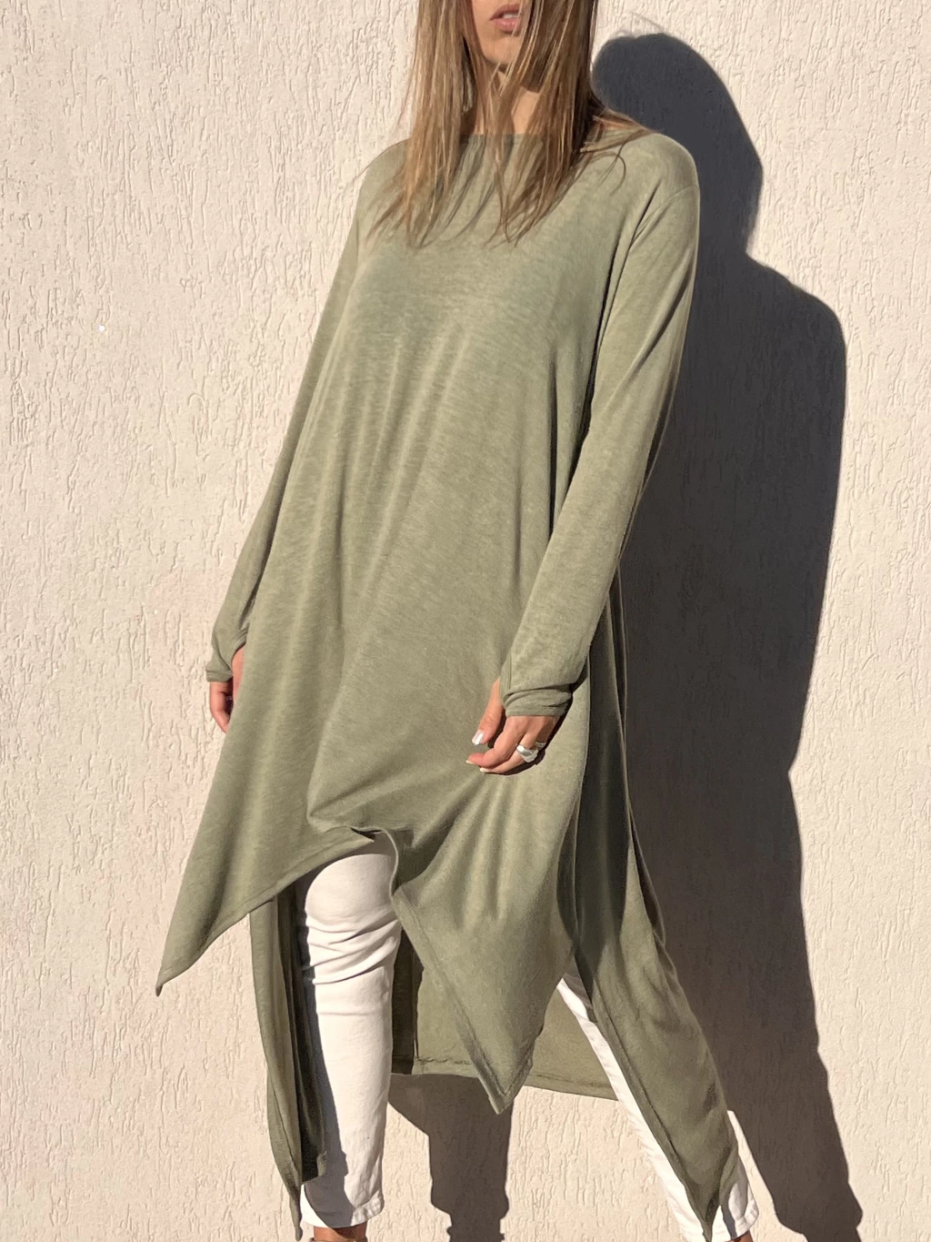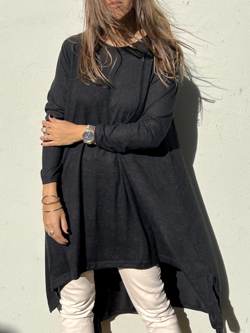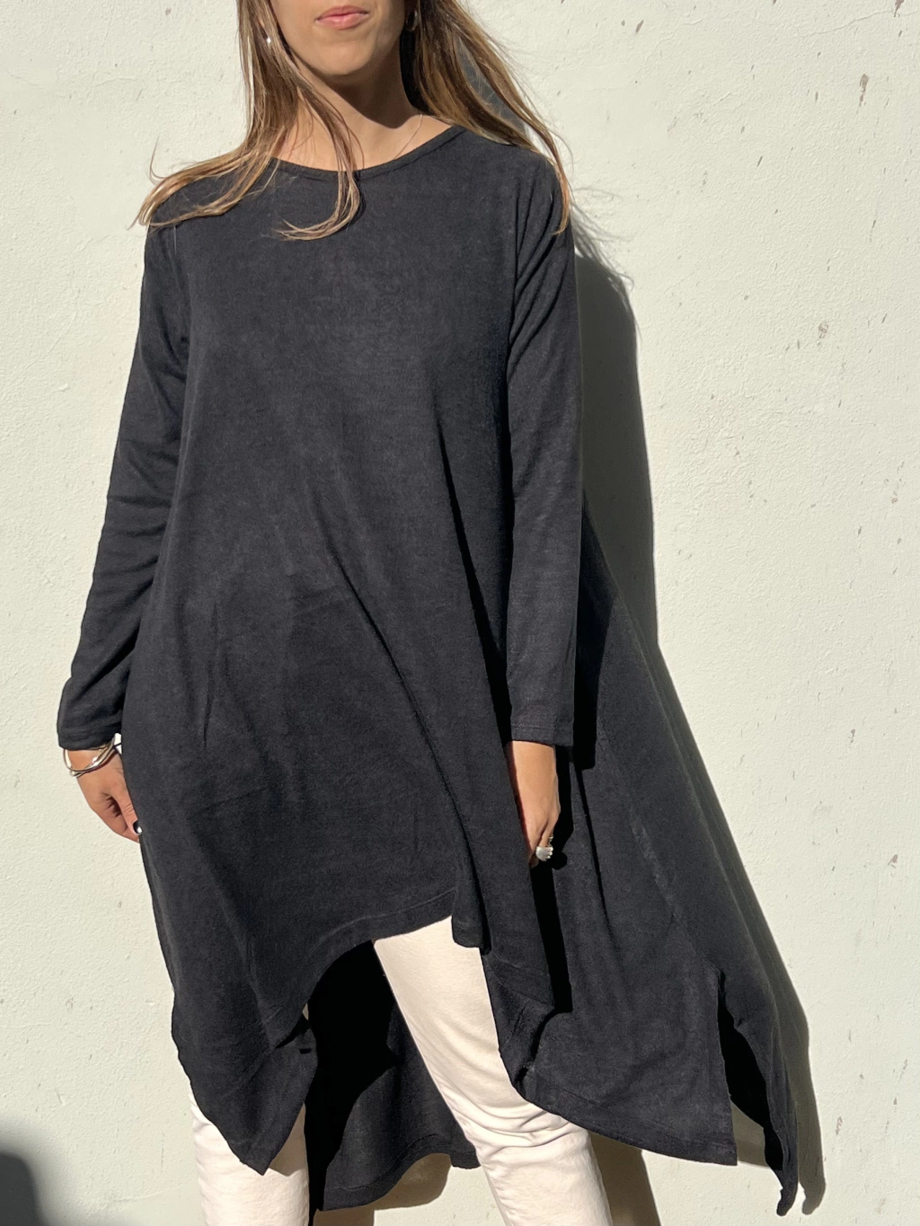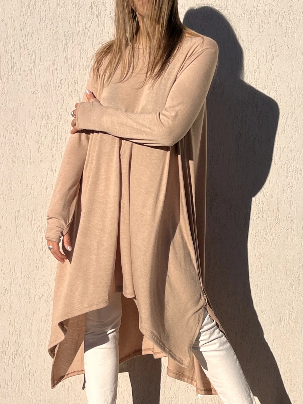 Vestido amplio largo con Terminación en puntas laterales. Con pasa pulgares. Confeccionado en Lanilla Viscosa de alta calidad.